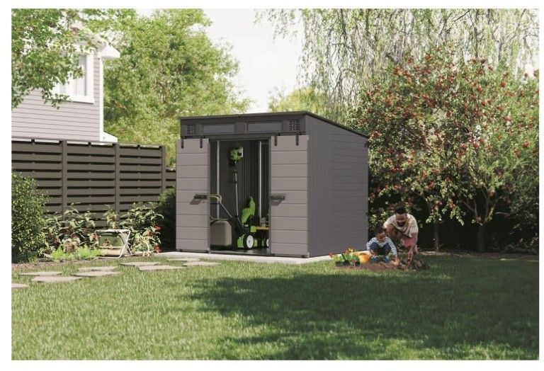 **Delivery Up To 15 Miles Included. Suncast 8’ x 7’ Storage Shed – Resin Build w/ Floor Kit** Well-built and spacious outdoor shed with a clean, modern look, designed for practical everyday storage. Made from durable multi-wall resin panels supported by a steel-reinforced frame, it offers strong resistance to weather, UV exposure, and moisture. The solid resin floor adds extra support for heavier items like lawn equipment or firewood. Features wide double barn-style doors (48” W x 72” H opening) for easy access, along with a secure pad-lockable design (lock not included). Two upper transom windows bring in natural light, making the interior brighter and more functional. Includes 4 tool hooks to help keep your space organized. Ideal for tools, garden supplies, bikes, and outdoor gear. Low maintenance-won’t rust, rot, or require painting. **Specifications:** * Brand: Suncast * Size: 8 ft. x 7 ft. (59 sq. ft.) * Capacity: 362 cu. ft. * Exterior Dimensions: 8.17 ft. W x 7.29 ft. D x 7.42 ft. H * Peak Height: 86.2 inches * Material: Resin with steel frame * Color: Cyberspace * Weight: 122 lbs * Floor: Included * Windows: * Door Type: Double barn doors * Max Wind Resistance: 65 mph * Roof Load Capacity: 40 lbs/sq. ft. * Assembly Required: Yes (tools required) Strong, weather-resistant, and functional - perfect mid-size shed for any backyard.