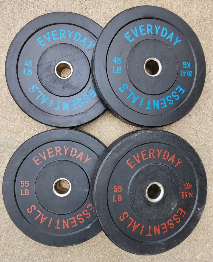 EXCELLENT PAIRS OF BUMPER PLATES!! Includes: 2 - 55lb Everyday Essentials Rubber Bumper Plates ($110) 2 - 45lb Everyday Essentials Rubber Bumper Plates ($90) First $200 cash takes them. Delivery available. I also have rubber and neoprene dumbbells, Olympic plates, Olympic bars, kettlebells, specialty bars, racks, benches, treadmills, commercial equipment, etc. just look at my other items or send me a message about them.