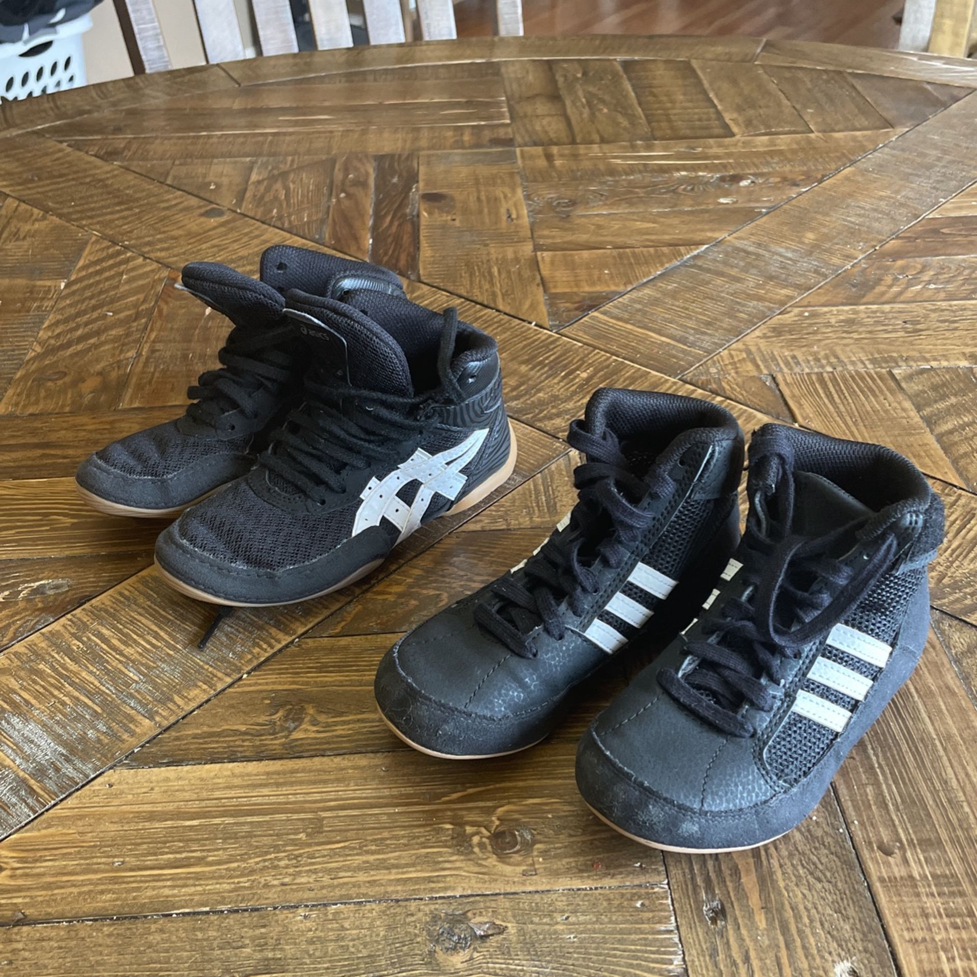 Size K11 ASICS and Adidas wrestling shoes. Great shape. $10 per pair. The red white and blue Rudis are $30 firm. They are size 12y