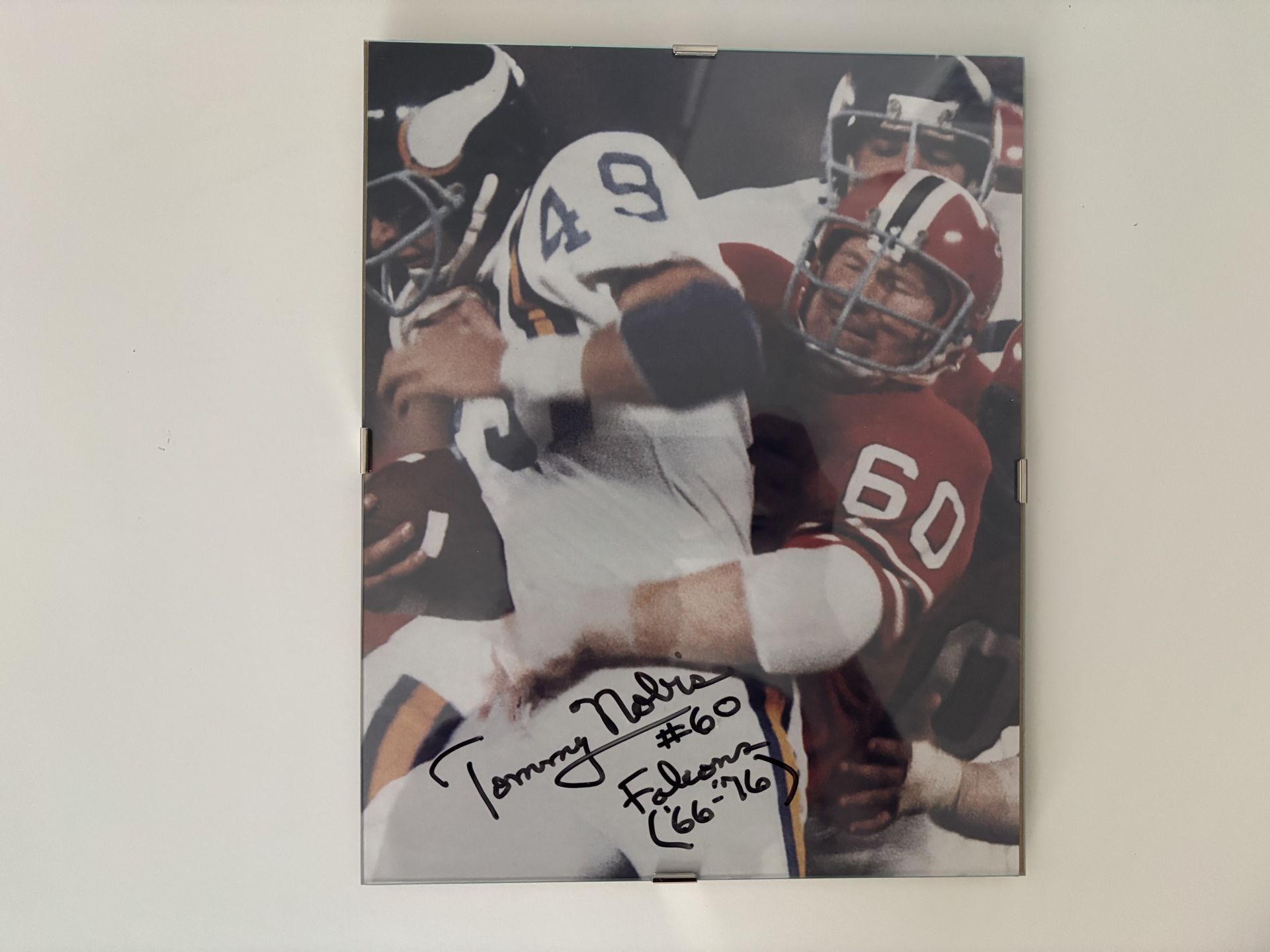 This 8 x 10 photo of the legendary Atlanta Falcons player Tommy Nobis is a rare find. The photo is still in excellent condition and comes with a light glass frame. The certificate of authenticity comes with the photo to verify the autograph. The autograph is legible. Perfect for any Falcons fan or sports collector. The asking price is $40. Pickup or meetup are both options.