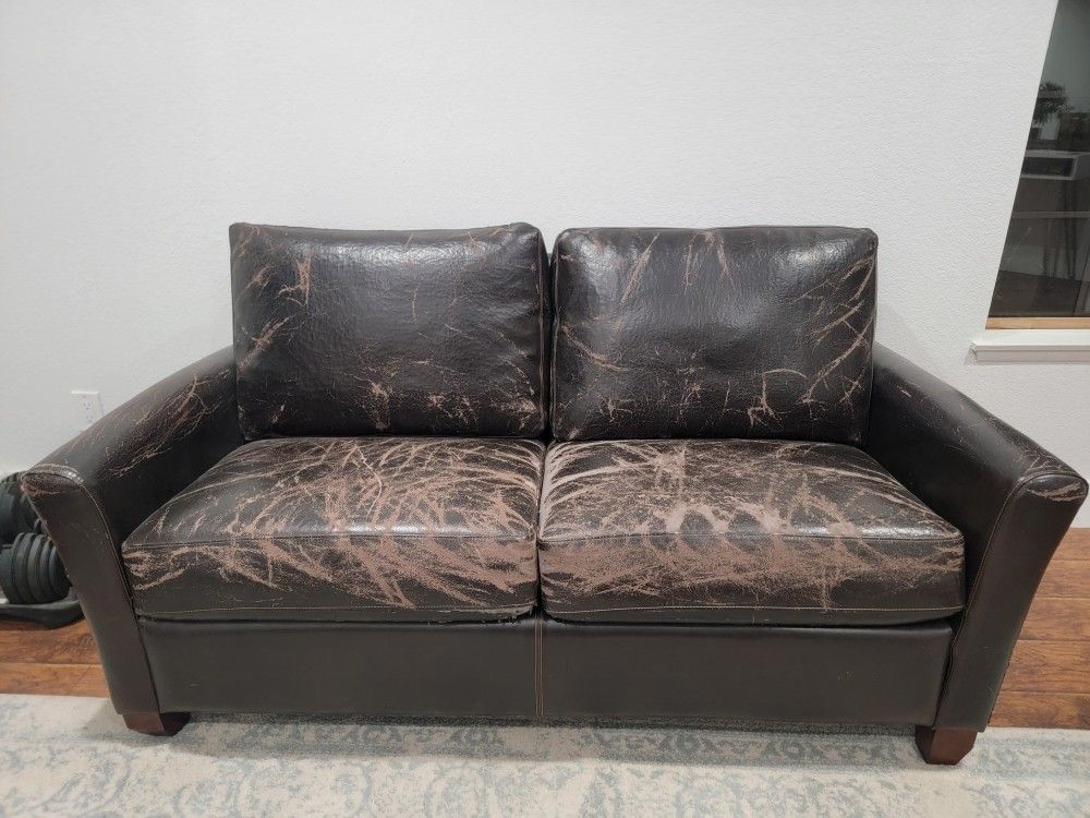 Free couch. Has peeling as shown in pictures. Pick up in Moreno Valley