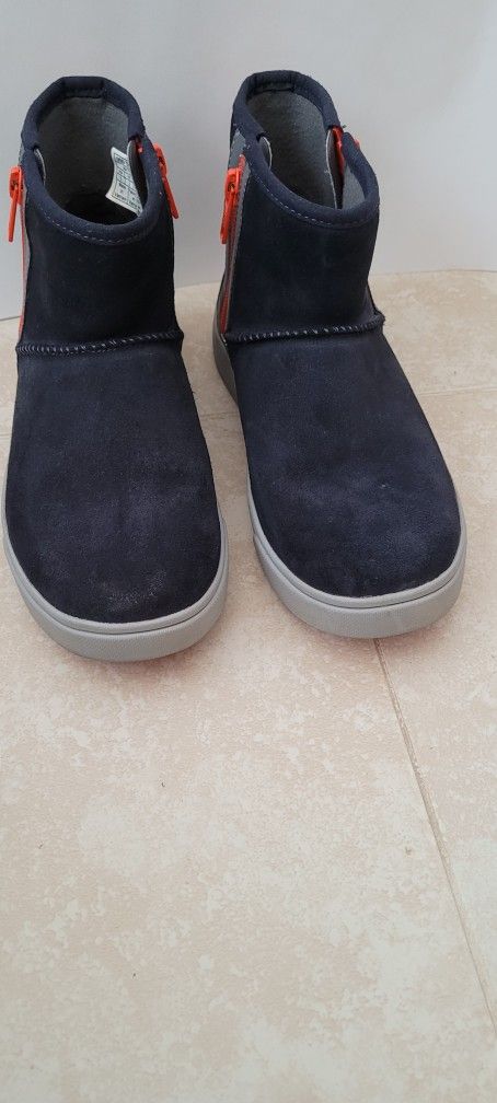 These UGGS boots are in excellent condition and are super cute! They were only worn 1 time. They are a deep Navy Blue color with Orange Trim.