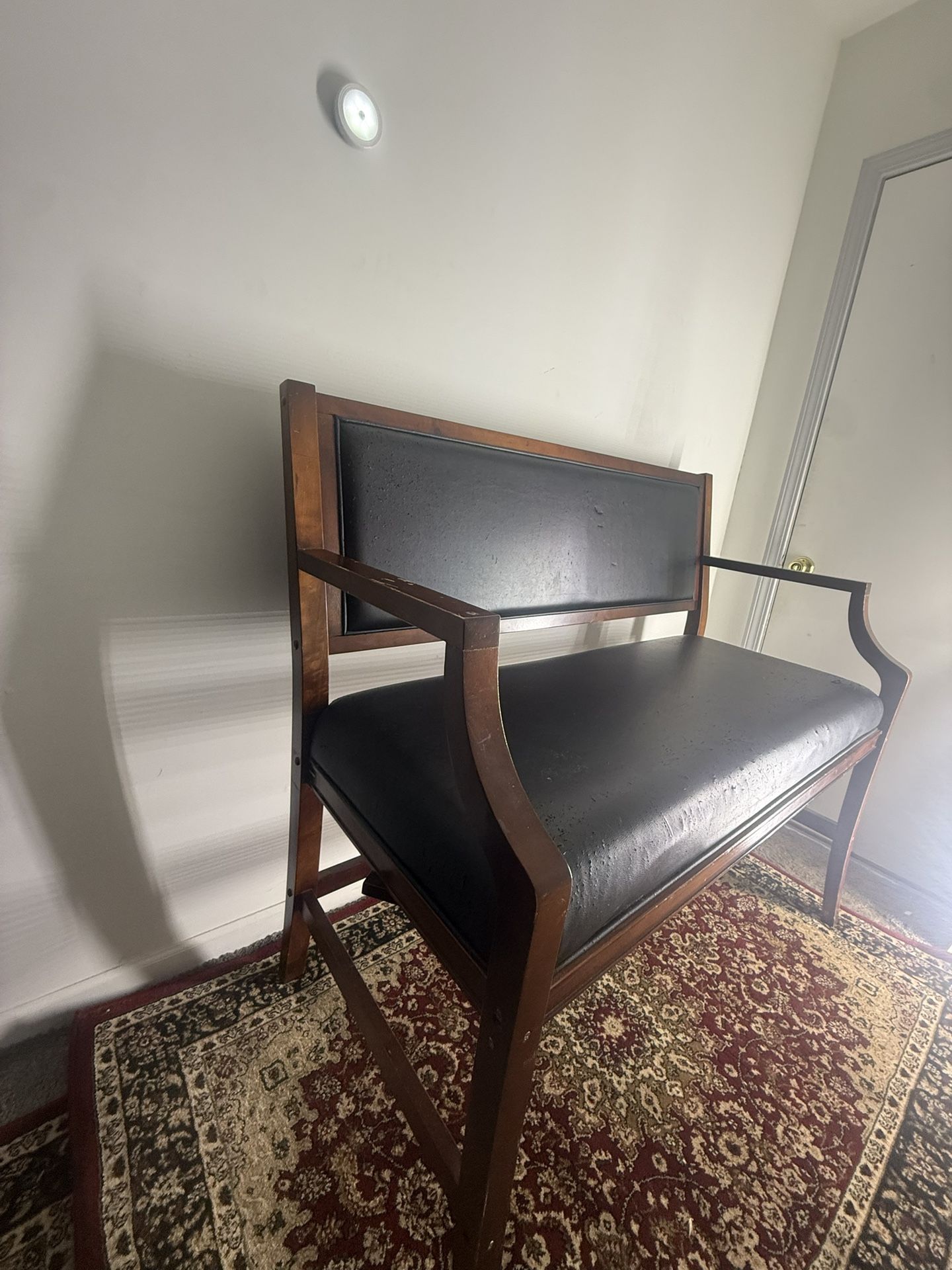 Comfortable, tall pool table bench perfect for a game room, man cave, or billiards area. Features a black leather-style cushioned seat and back, solid wooden armrests, built-in drink holders, and a convenient spot to rest pool cues. Details: Pool table / billiards bench seating Black leather-style upholstery (not sure if genuine leather) Wooden frame and armrests Built-in drink holders & cue rests Taller height – great for pool tables Condition: Pre-owned Some cat scratches on the leather One small tear in the upholstery Slight wobble (still usable, may need tightening or minor repair) Priced accordingly and great for someone who wants functional seating without paying new prices. Selling as-is. Local pickup only.