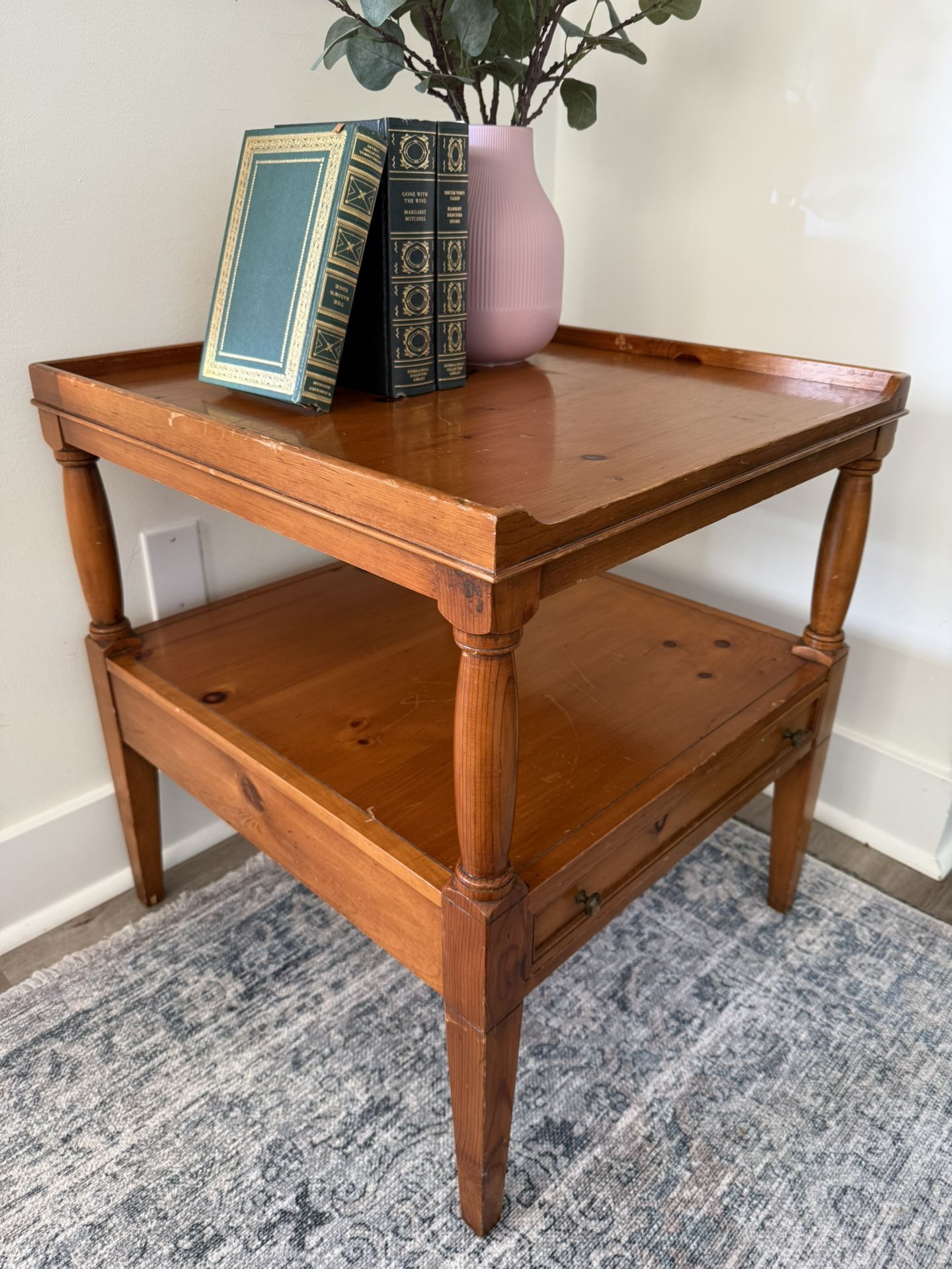 Beautiful Vintage Oak Brandt Furniture End Table. Made in Hagerstown, Maryland. One dovetail drawer. 23.5”Dx22”Wx25.5”H
