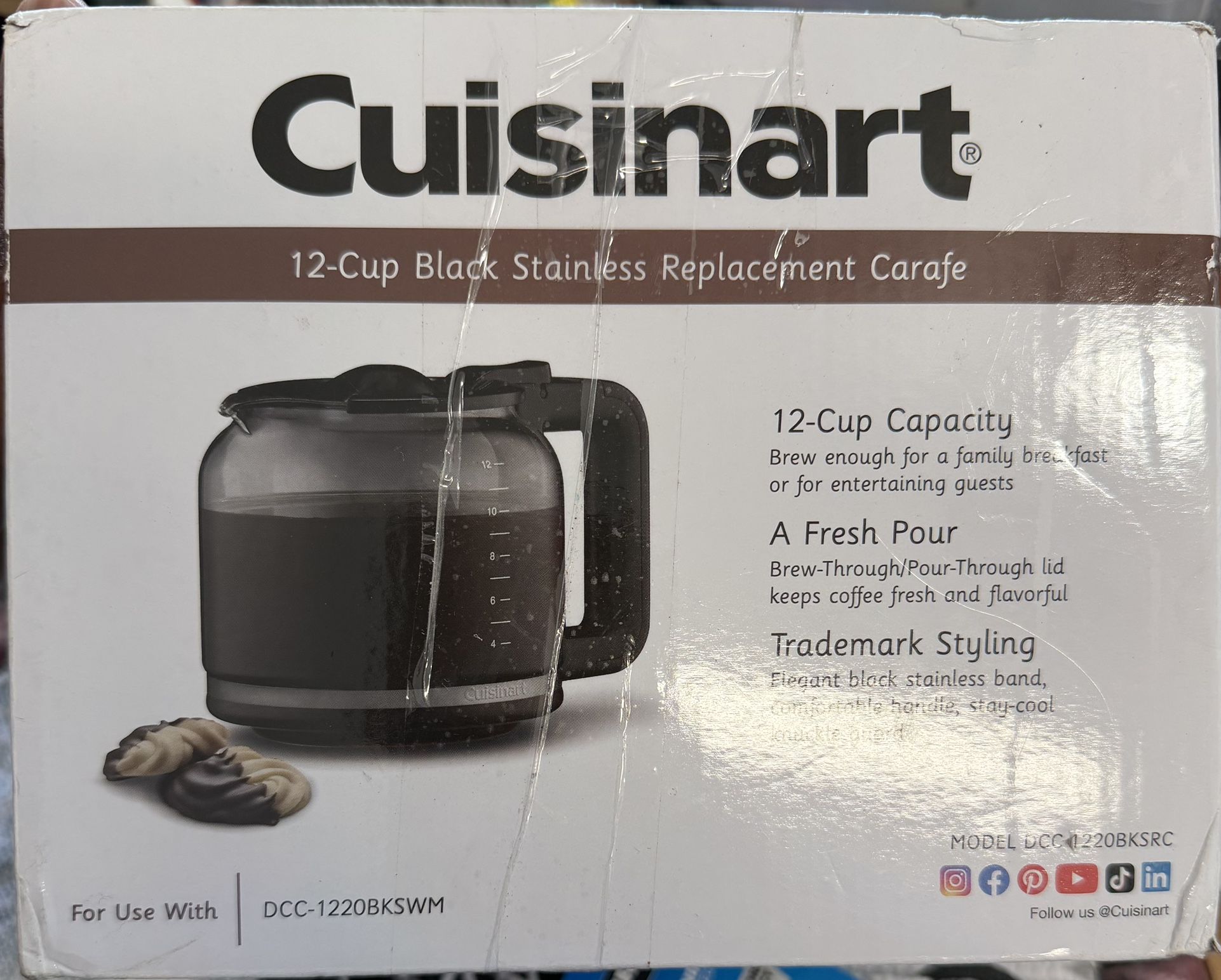 : Keep your coffee routine smooth with this Cuisinart 12-cup replacement carafe, designed for DCC-1220 series coffee makers. It features a sleek black stainless band with a comfortable, stay-cool handle for easy pouring. The brew-through lid helps maintain freshness and flavor, so every cup tastes just right. Perfect for replacing a broken or worn-out carafe without buying a whole new machine. This item is open box and gently used, still in great condition and ready to go. Key Features: • 12-cup capacity, great for family or guests • Brew-through lid keeps coffee fresh • Elegant black stainless design • Comfortable, stay-cool handle • Compatible with Cuisinart DCC-1220 models