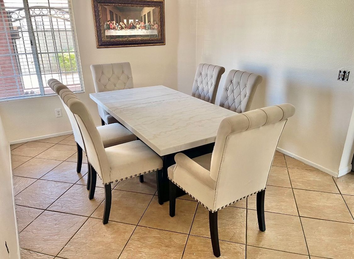White marble table top Espresso wood base 4 Beige tufted side chairs 2 Beige tufted arm chairs Everything Comes Brand New Delivery Available Ready to buy? Contact me direct 951-251-2983 Follow my Instagram @Furniture.Boss You can also follow the link below to see more fantastic deals: https://offerup.co/profile/furnitureboss Thanks for reading my ad