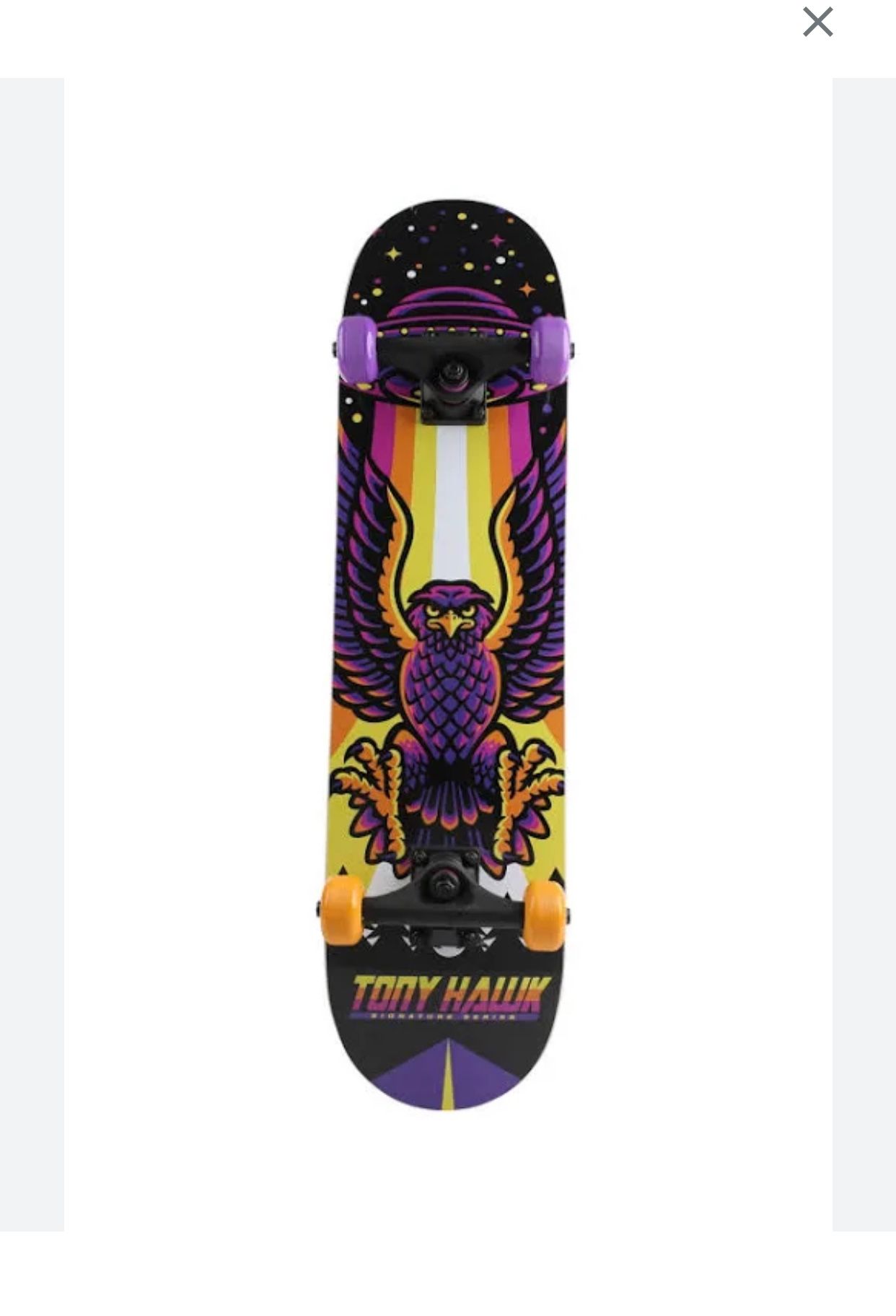 The Tony Hawk 31 In. UFO Standard Skateboard is a complete high-quality double kickboard skateboard with a 31" x 7.5" 9-ply maple wood deck, 5" composite trucks, and 50mm x 30mm multi-colored injected wheels with ABEC 3 bearings. It is perfect for active outdoor kids and can hold its own at the local skatepark or skateboard ramp. The skateboard deck is durable and can take a little abuse at the skate ramp, and the sleek traditional design makes it much more versatile than standard cruiser skateboards. It makes the perfect gift for teen girls and boys who are fans of the legendary skater Tony Hawk.