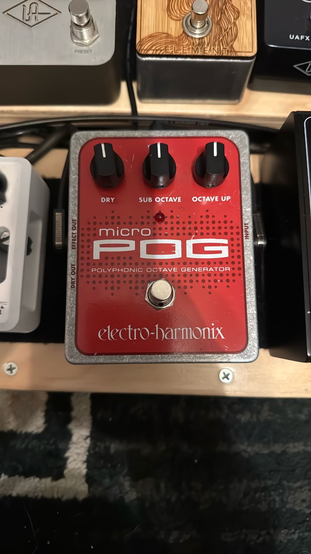 Micro POG Electro Harmonix -3 octave polyphonic octave generator -comes with original knobs as well! -tracks very nicely when placed early in chain, great with compressor to pull in all frequencies before buffered fx out. -get anything from a bass emulation tone to a 12 string tone, even a synthy organ-like tone with some pedalboard fun