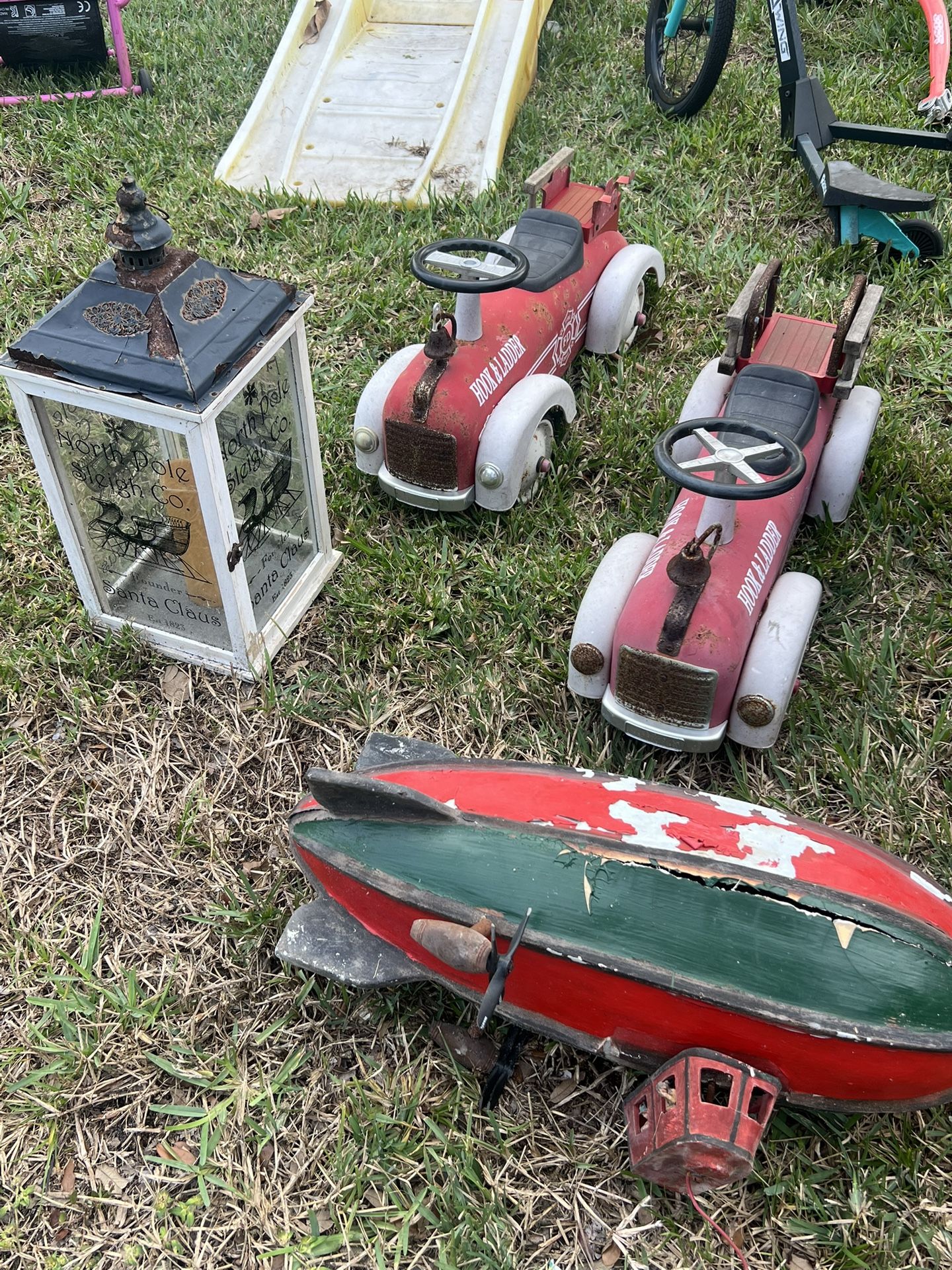 2 Vintage Hook & Ladder Fire Ladder Trucks, Vintage Vintage 31" Blimp Zeppelin Airship Aviation Model Needs restoration
