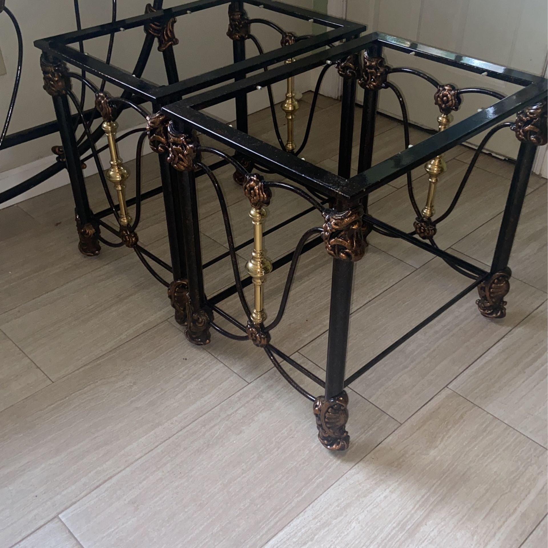 A complete Iron bed set top head and bottom 2 nightstands with glass, picture shows no glass, but I do have them.