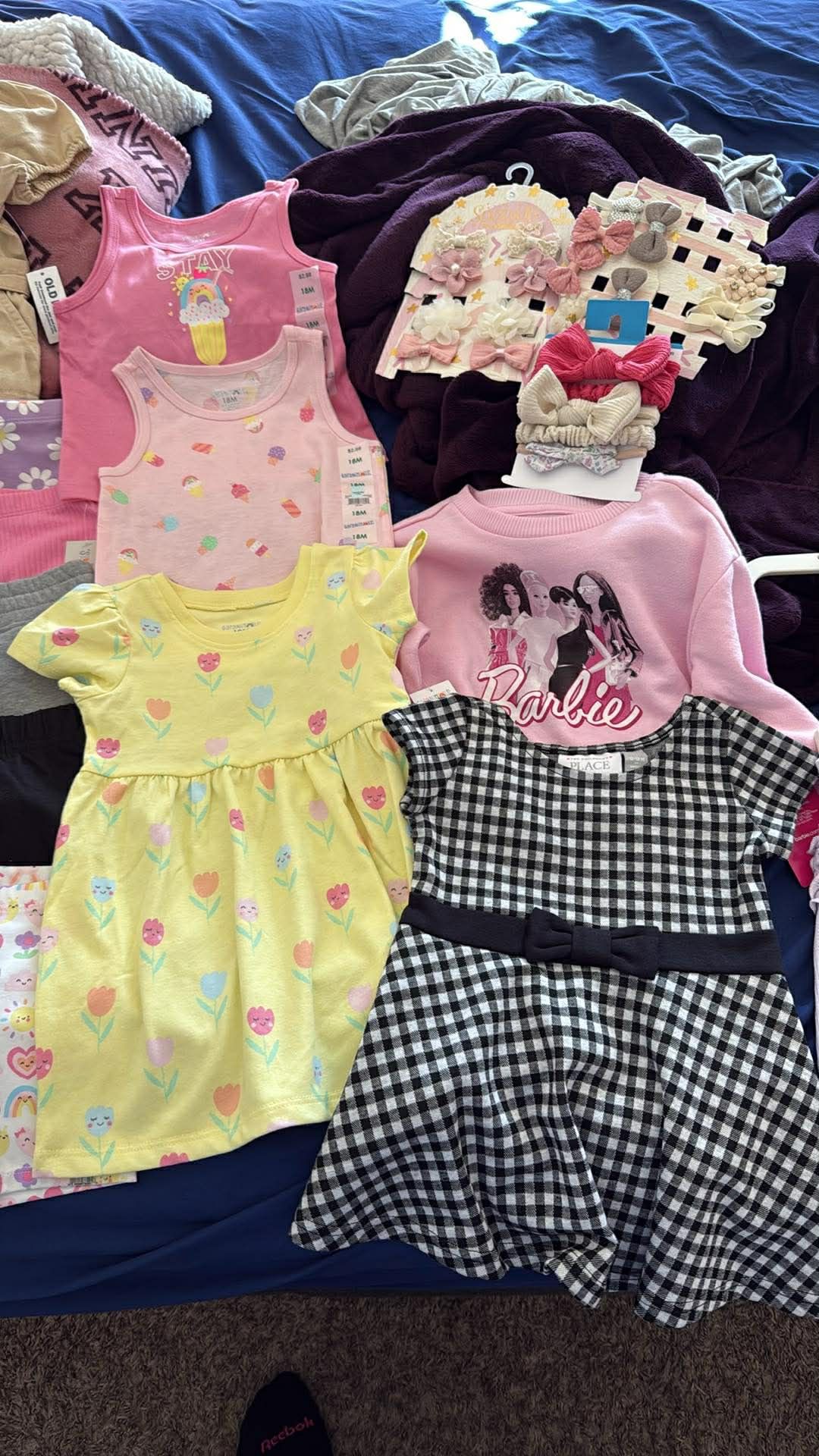 1 outfit 3 dresses 1 romper 2 onesies 5 shorts 2 tank tops 1 sweater Christmas pj Hair bow clip set Headband bow set Size 18 months