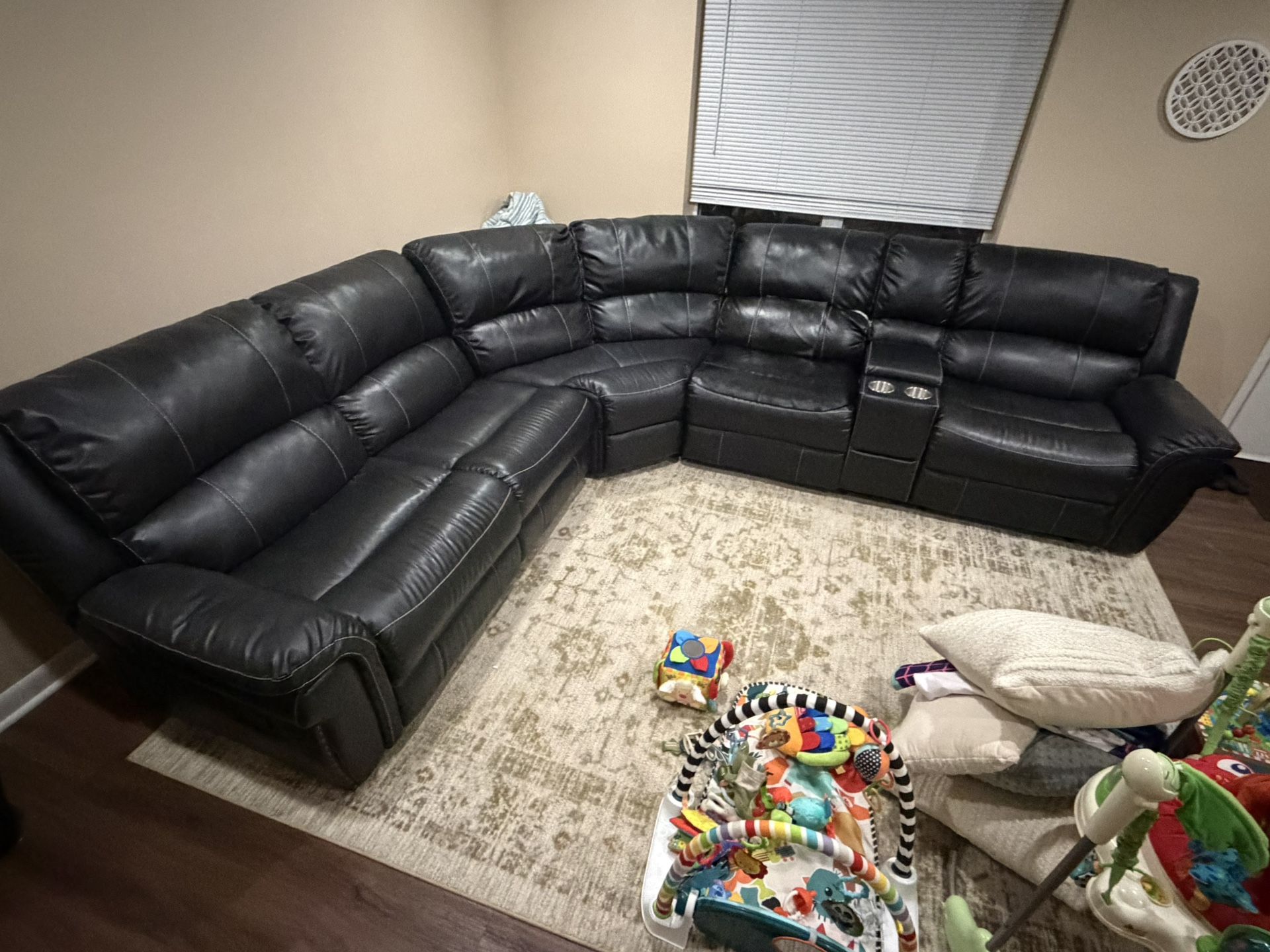Faux black leather, three seat reclining, large sectional couch. Comes apart in three large pieces. You’ll need a big truck to haul this beast. DISCLAIMER: The one seat next to the center console is beat up. It is still structurally sound and comfortable, but It has a slight lean when reclined back and the leather has been patched with leather sheets. All the other seats are in good condition. All three recliners open and close with ease. There is an outlet wired into the center console box. Approximate Measurements: 106”x119” (9.5x10) 38” tall, 40” deep, 28” wide seats. Sells new for 3k. I’m selling for 100. Cash only, pick up only.