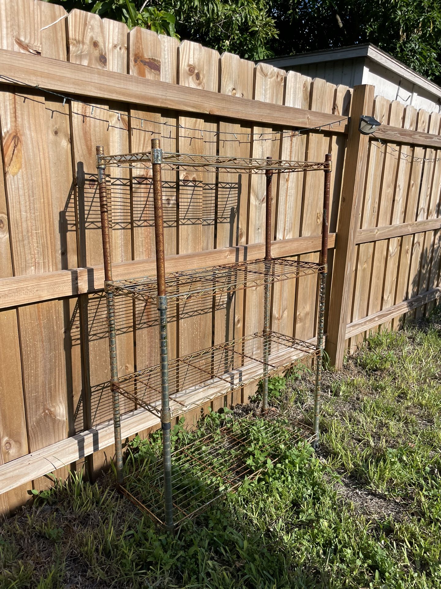 Strong shelf. Rust remover should take the rust right off or steel wool. I was going to spray paint it black but I just moved my flower pots off the porch so I don’t need this anymore.