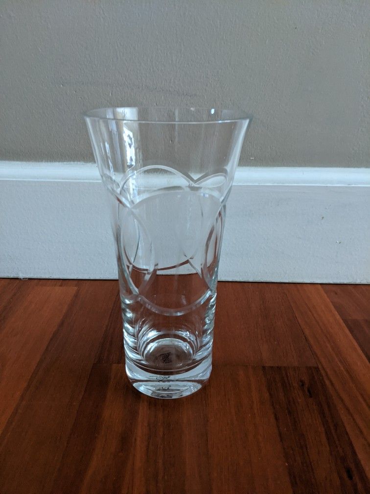 WILL DELIVER FOR A FEE 8" by 4 1/4" wide glass vase, very nice design, clean and in excellent condition.