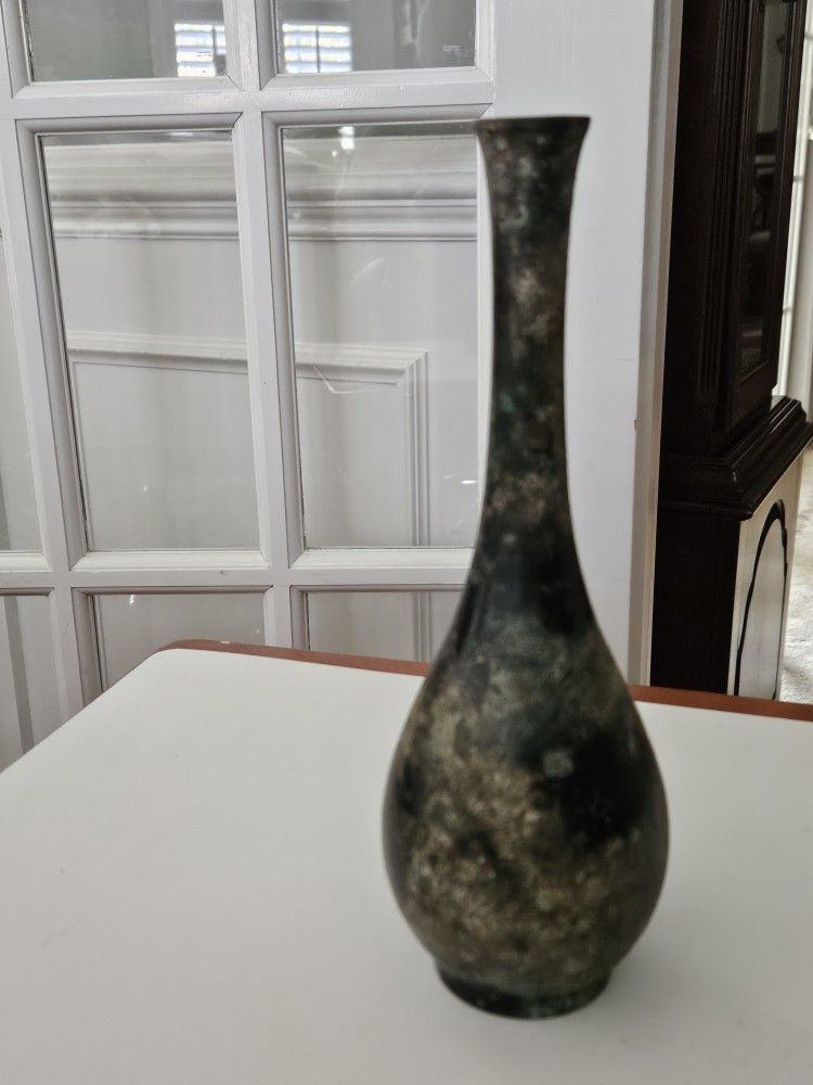 Interesting verdigras bronze vase made in Japan late 19th early 20th century vintage. Small dent in base, hardly noticeable. Nice piece. Ask about shipping. 9" tall, 3" at widest point of teardrop. Rare offer.