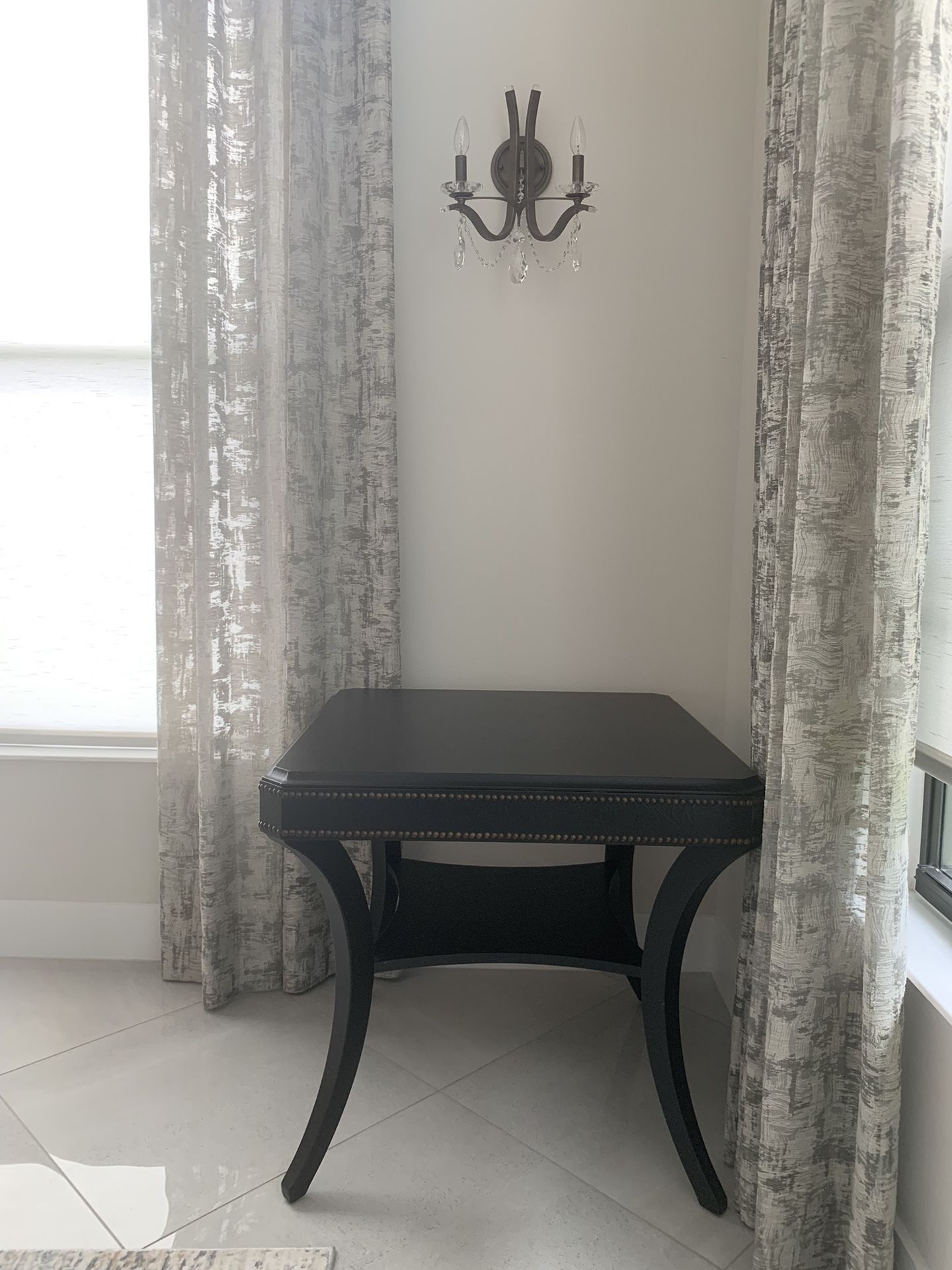 A pair of lamp tables from Ethan Allen , in great condition . Originally $700 each . Black Leather looking with Bronze nail head. Dimensions: 29”x29”x27”H Pickup and cash only .