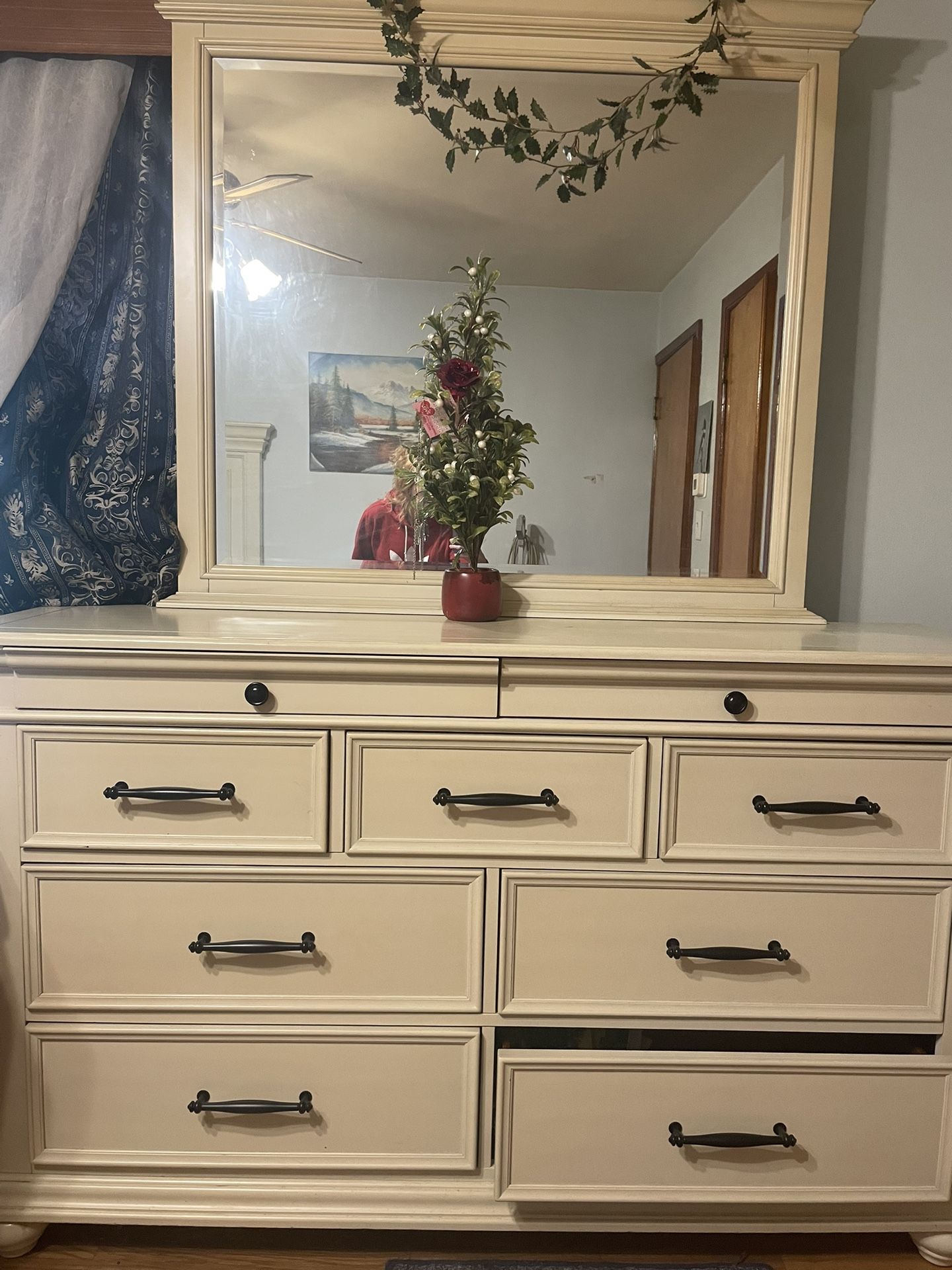 Queen size bed frame 1 tall dresser 1 dresser with mirror 1 nightstand