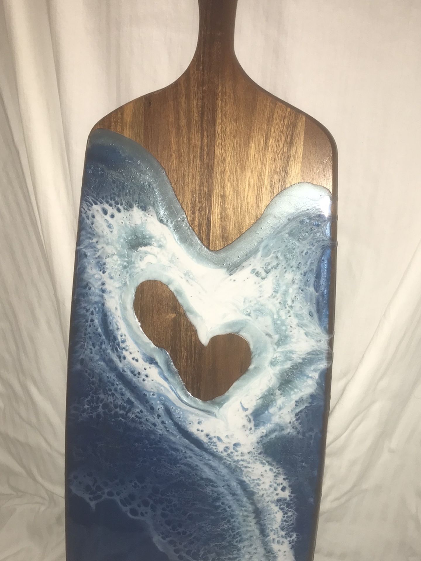 Hand-poured epoxy resin charcuterie cheese board, perfect for any occasion. Measures 24 inches long by 9 inches wide. Epoxy resin is food-grade with a blue ocean heart. Perfect for a last-minute Valentine’s gift, housewarming gift, ocean decor, or beach house. This is a handmade item.