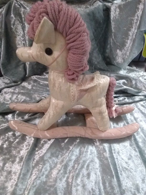 Hand made overstuffed pink rocking horse. Dimensions are 9.5 inches tall and 12 inches long. Very well made and sturdy.