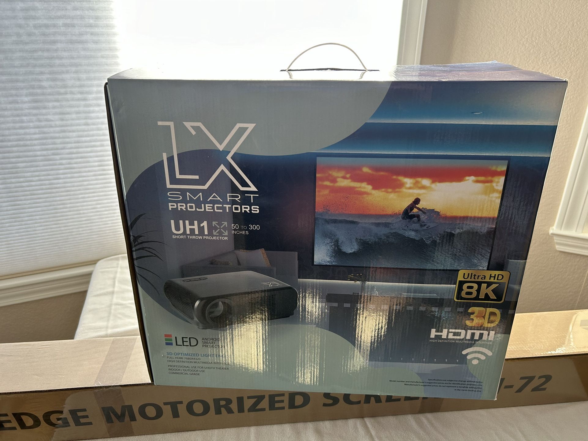 LX UH1 8K 3DHDMI Smart Projector w LX72B Digital Projector Self Lock Screen, brand new.