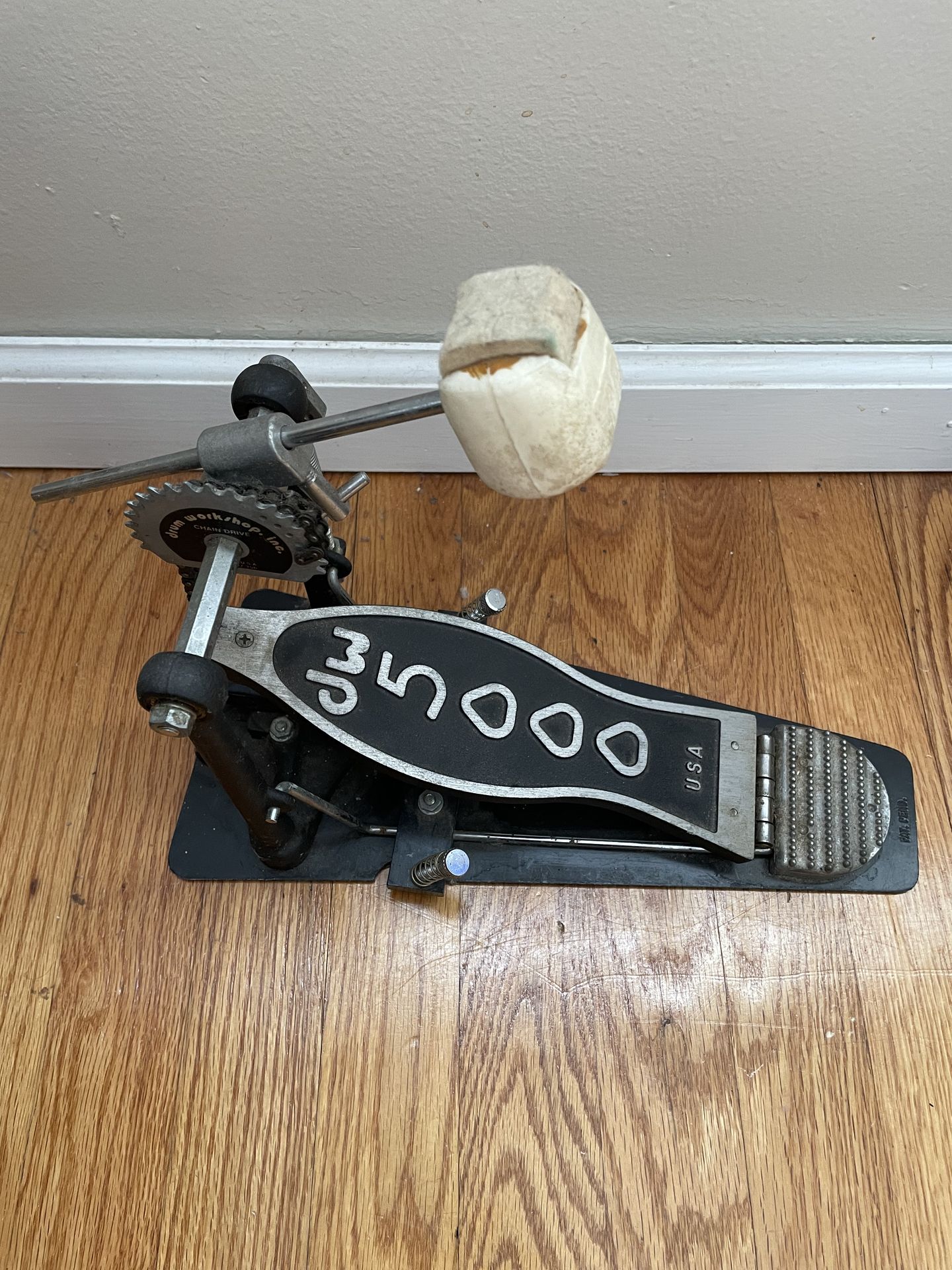 this is a vintage DW 5000 bass drum pedal. This is one of the early chain drive versions from the 1980s before they came standard with the metal base plate. It's in great condition with light play wear. It's fully functional and plays well. Includes a DW Felt/Wood two-way beater with its counterweight. Cool useable piece of Drum Workshop's history. Enjoy