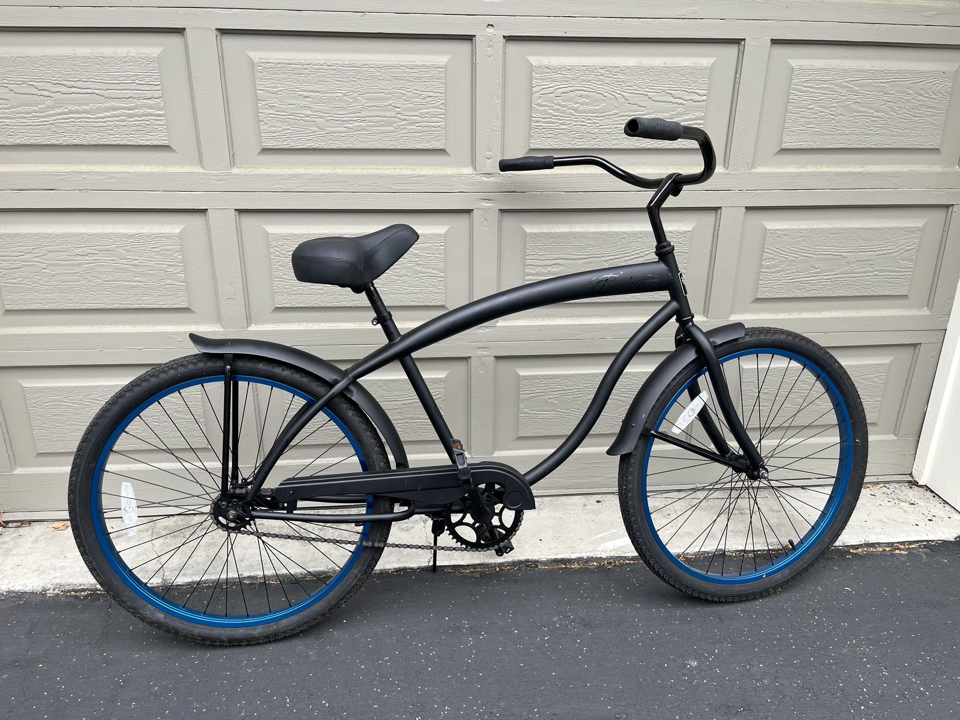 Freedom brand. Cruiser. 26” wheels, everything is in great condition, tires still have knobbies. Matte black with blue wheels. Comfort seat and grips. $100!