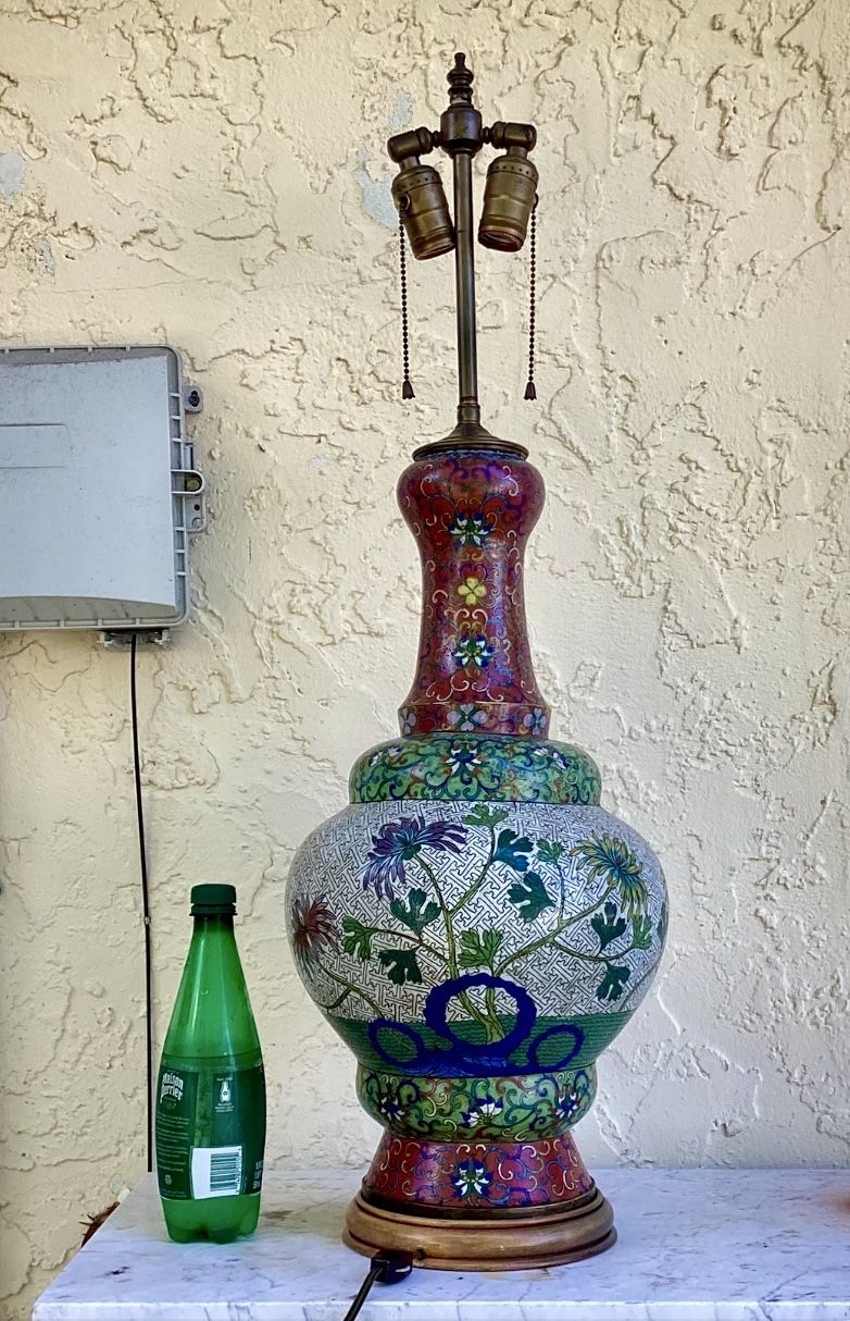 Very beautiful and Large Antique Cloisonné Garlic Head Vase converted to a lamp many years ago. From a Star Island, Miami mansion. Working