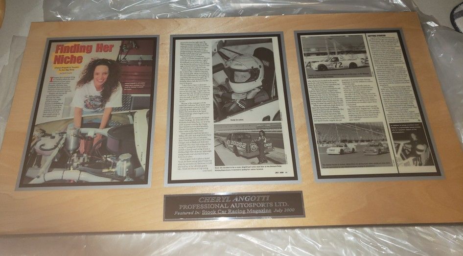 Cheryl Angostura Professional Auto Sports Stock Car racing magazine plaque. July 2000. 29 in by 15 in