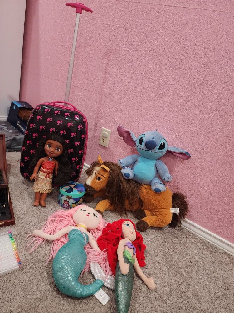 Barbie Luggage Spirit Stitch Moana Ariel Mermaid Jazmin Pens Misc items. Not separating. All items for 25$. Round Rock porch pick up. Will take cash but prefer venmo. No refunds. No holds. No trades. Thank you!