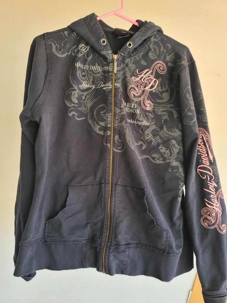 Stylish Harley-Davidson full-zip hoodie. Dark gray with cool pink and gray graphics. Has front pockets and a hood. Zipper works good.