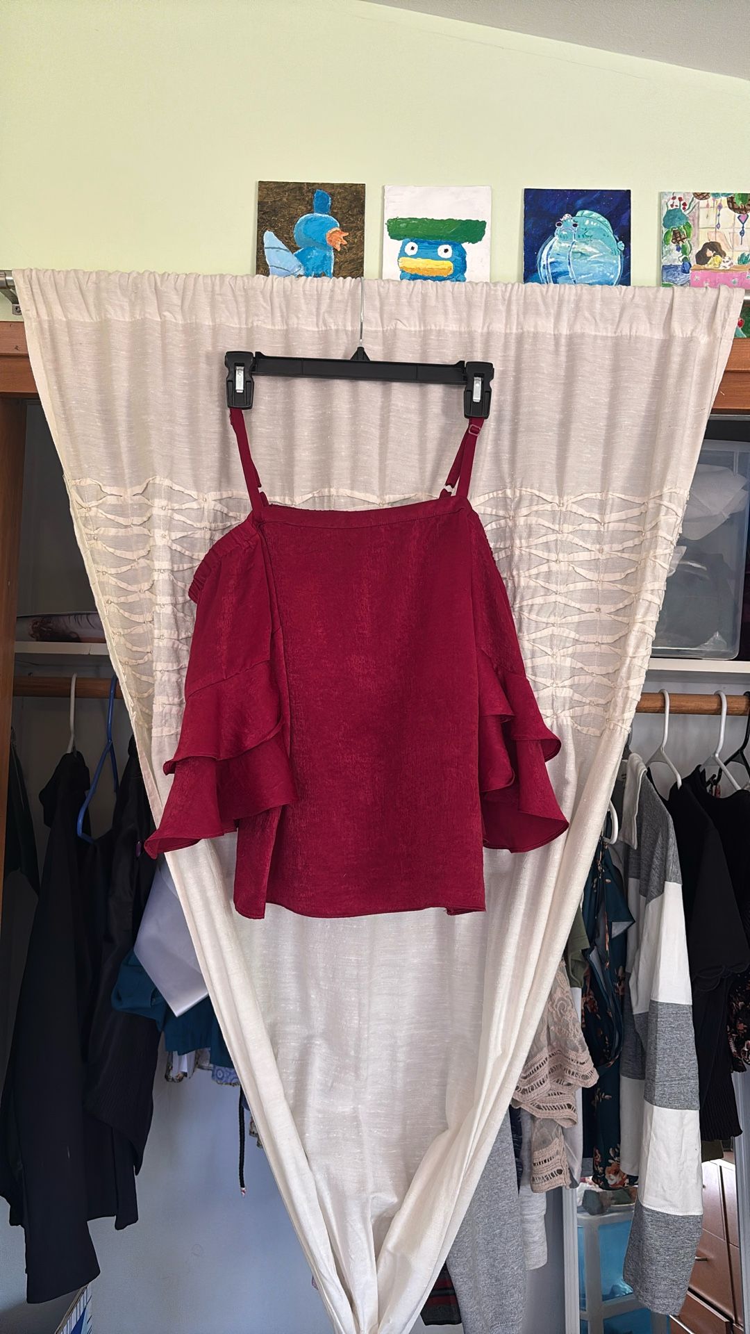 A wine Red off the shoulder with trumpet sleeve shirt. Back has elastic and straps are adjustable . Junior Medium