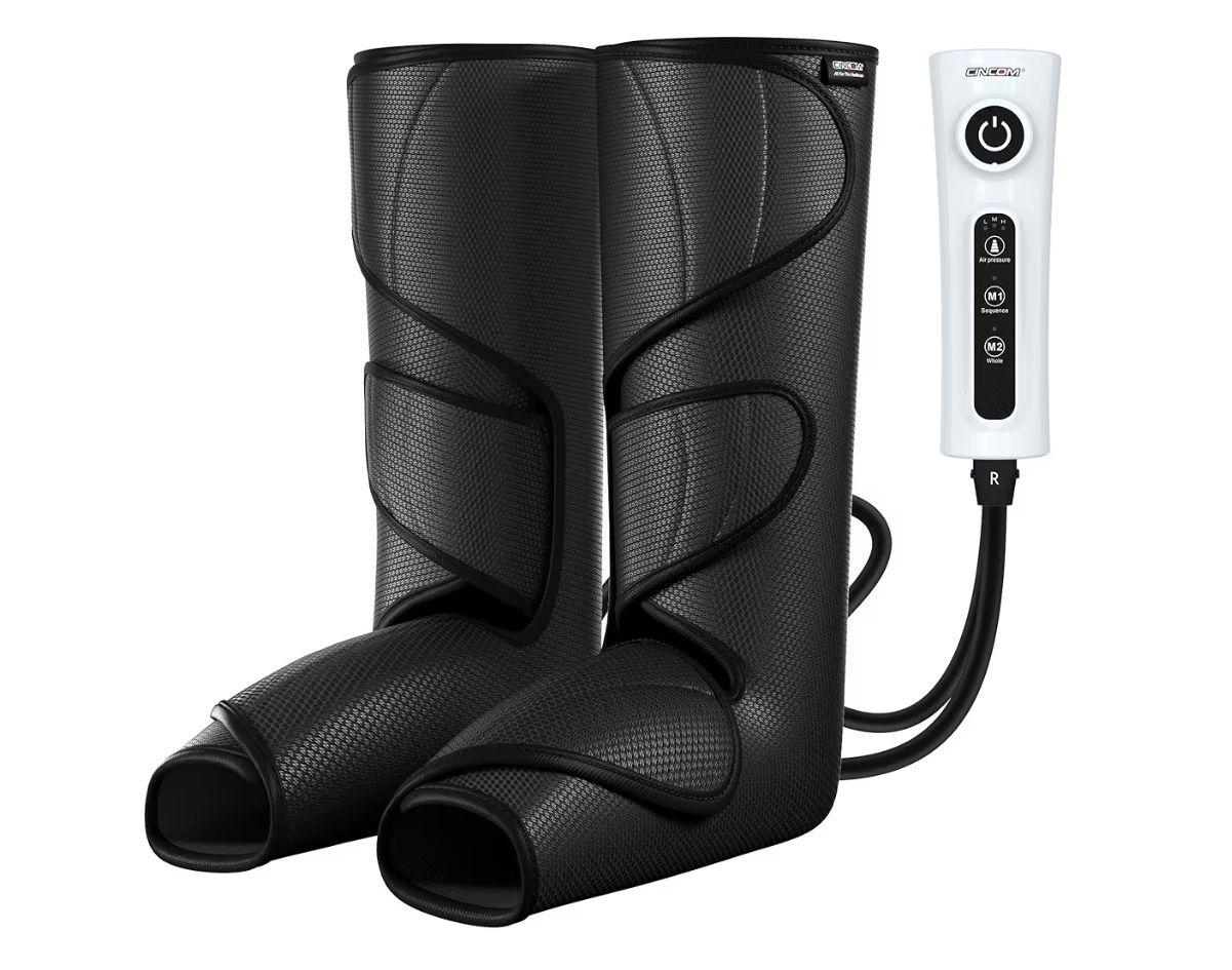 CINCOM Leg Massager for Circulation and Pain Relief, Air Compression Calf Foot Leg Massagers with Handheld Controller, Legs Circulation Machine Use for Legs Power Source Corded Electric Material Polyester Item Weight 3.4 Pounds Brand CINCOM Color Black Polyester 【Soothing Leg Air Compression】Discover the power of gentle air pressure with air compression massage techniques. From your calf to your foot, the rhythmic inflation and deflation create a wave-like compression that envelops your legs in soothing relief—promoting healthy circulation, easing sore muscles, and delivering daily comfort to tired legs. 【Safe & Gentle for Everyday Use】Thoughtfully designed for everyday leg comfort, especially for parents in need of gentle leg relief. The 20-minute auto shut-off ensures safe use every time—offering peace of mind along with soothing compression. Whether it’s part of your evening wind-down or a thoughtful wrap for dad or mom, the CINCOM foot and leg massager fits seamlessly into any routine with care and ease. 【Customizable Compression Therapy】Whether you’re easing daily fatigue or seeking targeted relief, the leg compression boots offer a personalized experience with 2 massage modes(M1/M2) and 3 intensity levels(Low/Mid/High). Its intuitive handheld controller makes it easy to find your perfect setting, helping relax tight calves and bring soothing comfort when you need it most. 【Flexible Fit with Extra Extensions】Worried about sizing? This sequential compression device for legs is designed to comfortably fit calves up to 22 inches, and comes with 2 extender pieces to expand extra-large coverage up to 28.5 inches. The adjustable Velcro design makes it easy to share between family—comfort made for every legs size. 【Giftable Comfort with Trusted Care】Wrapped in ultra-soft, breathable nylon with a polyurethane laminate fabric, it feels as cozy as a warm hug. Perfect for birthdays, Mother's Day, Father's Day, Christmas, and New Year's, or simply saying “I care,” the CINCOM leg massager brings more than relief—it brings connection.