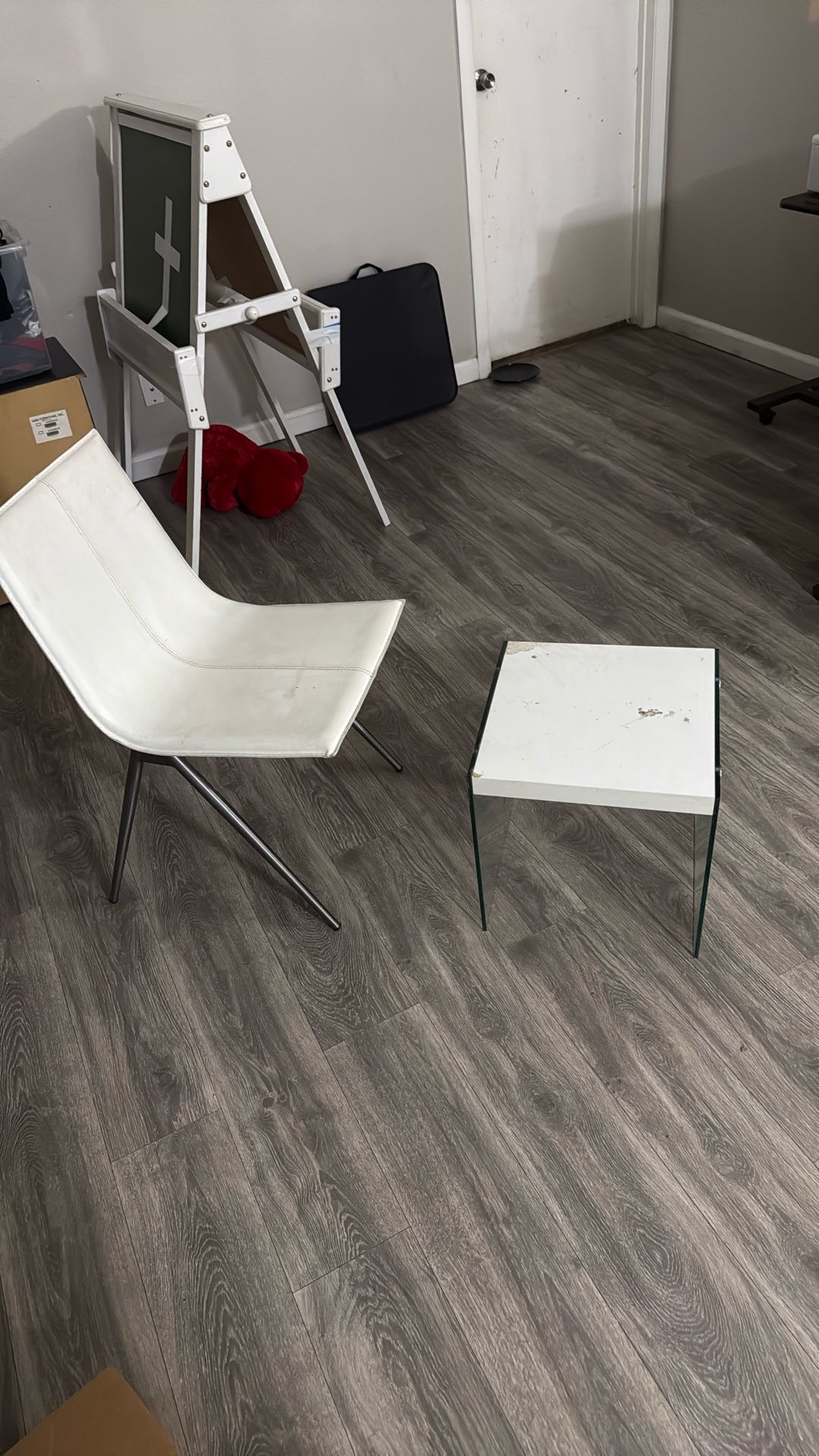 White Leather Chair With Metal Legs And White Table With Glass Leg Support