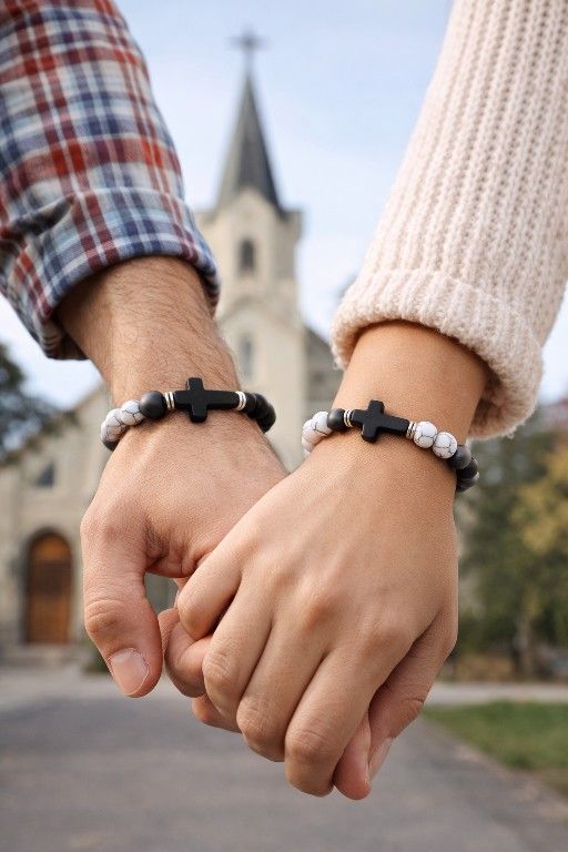 Vintage fashion beaded bracelet set featuring stone beads with cross pendants. This matching set is ideal for couples, friends, or individual wear. The set features a black and white stone bead design with a bold cross centerpiece giving it a timeless vintage and gothic-inspired ook. Material: Stone Style: Vintage, Gothic Pattern: Colorblock, Plain Set Includes: 2 matching bracelets Condition: New Wear: Casual daily wear SKU: sm(contact info removed)98777