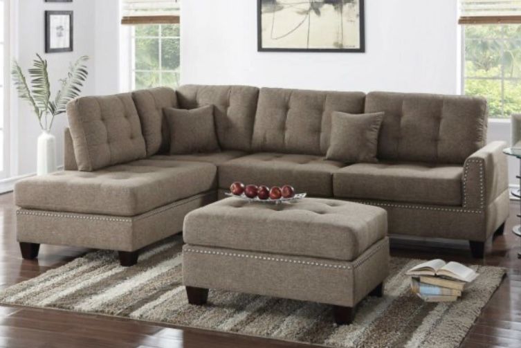 A chic design of fashionable flare is delivered with this 3-piece sectional sofa covered in a smooth but functional fabric. The lower portion is trimmed with nickel finished studs and the seating is of pure, plush comfort Sectional Sofa + Ottoman Color: Coffee Materials: Polyfiber Plywood base panel with solid pine frame Wood legs Pocket coil seat cushion with foam encasement Some Assembly Required Dimensions: Sectional: 104″ x 75″, Ottoman: 36″ x 25″ x 19″H