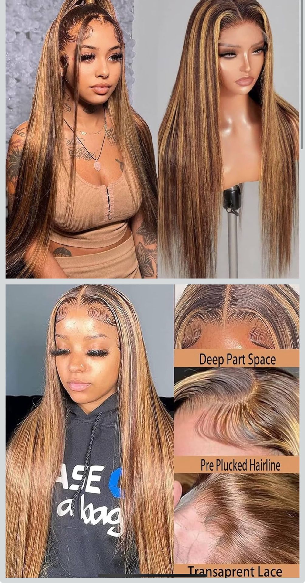 Ombre 13x6 Lace Front Wigs Hair Pre Plucked 180% Density Honey Blonde HD Transparent Straight Lace Frontal Wigs with Baby Hair #4/27 Colored Glueless Wig for Women 30 Inch 523