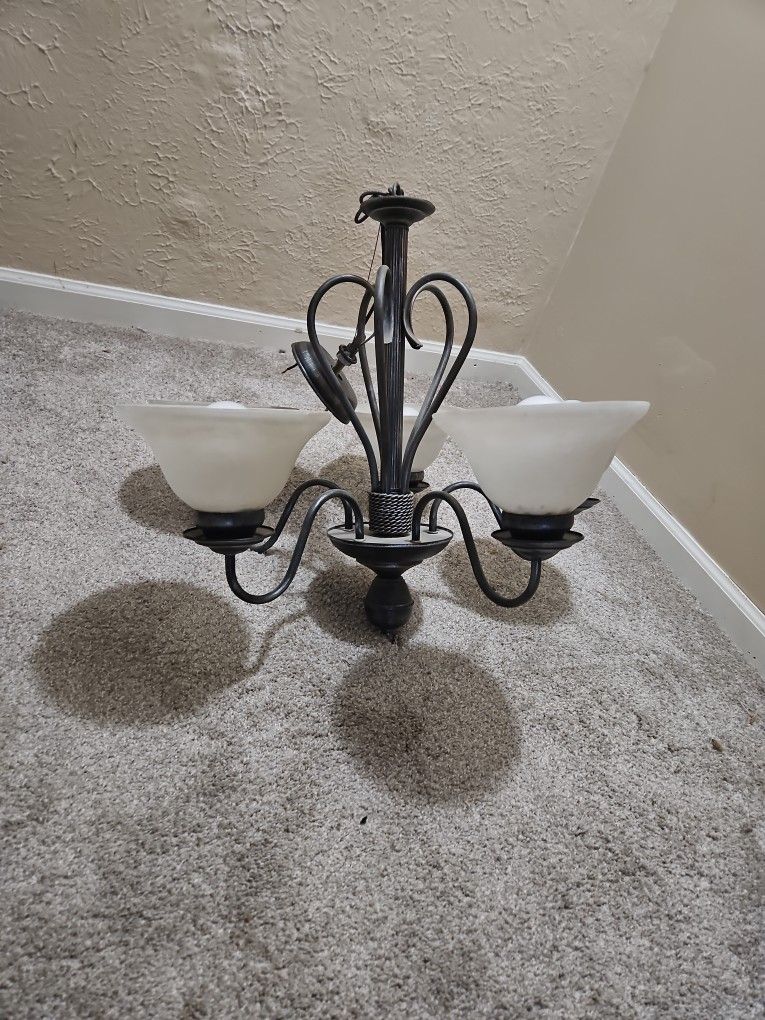 Brushed metal chandelier. 5 lights with glass shades. Perfect for a dining room or kitchen