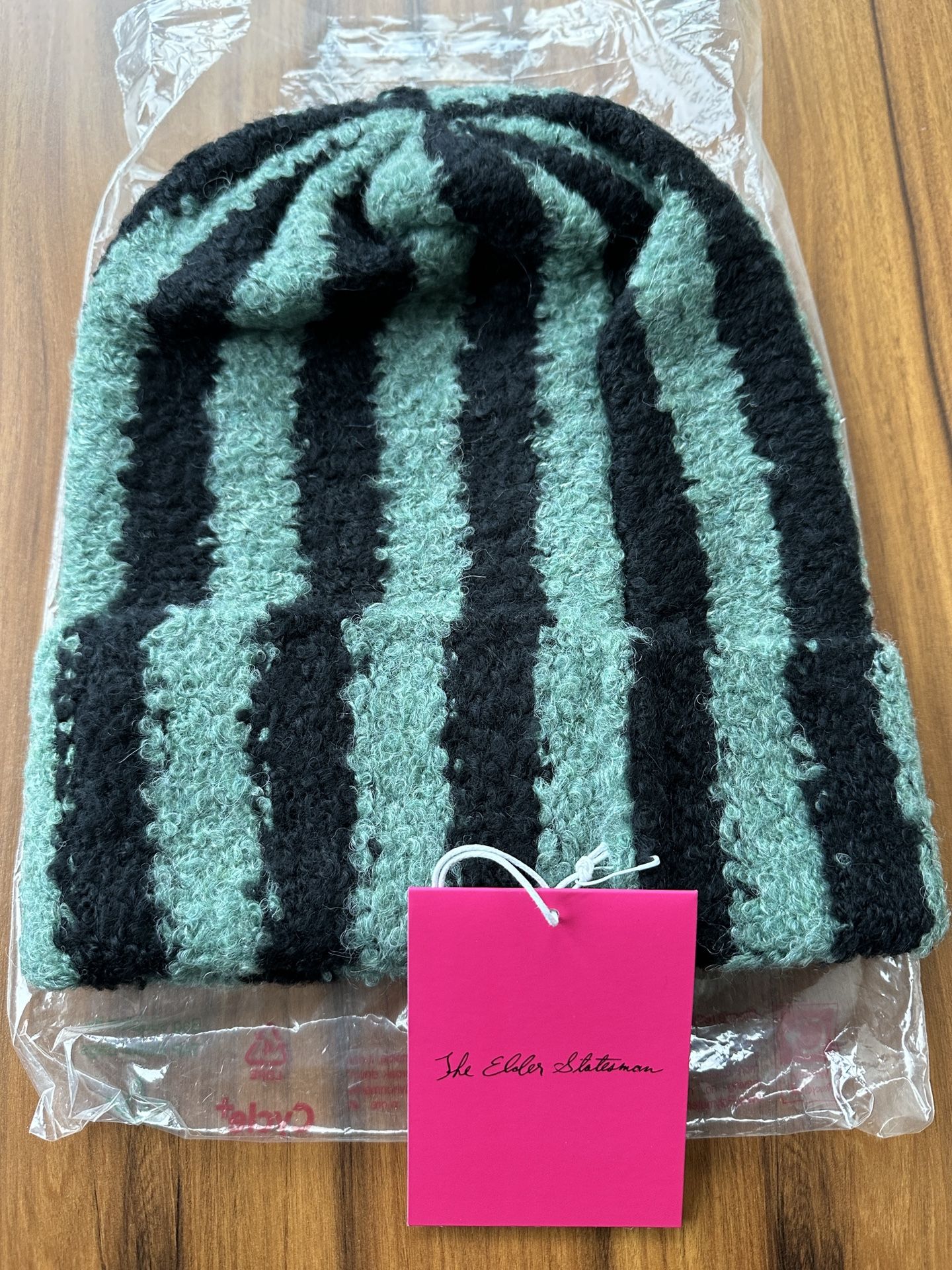 Selling my brand new The Elder Statesman Echo Stripe Parker Beanie. Turquoise and black color way. Made of 48% cashmere, 32% Alpaca, and 20% silk.