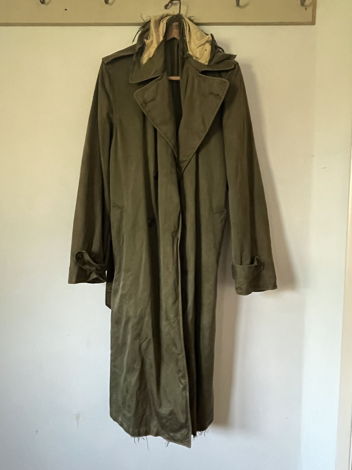 1950 military trench coat. Very vintage mix As you can see it has some were from time. But I’m selling it cheap compared to what they are asking for comparable on eBay. Not missing any of the buttons. Make an offer no room for it in the closet anymore