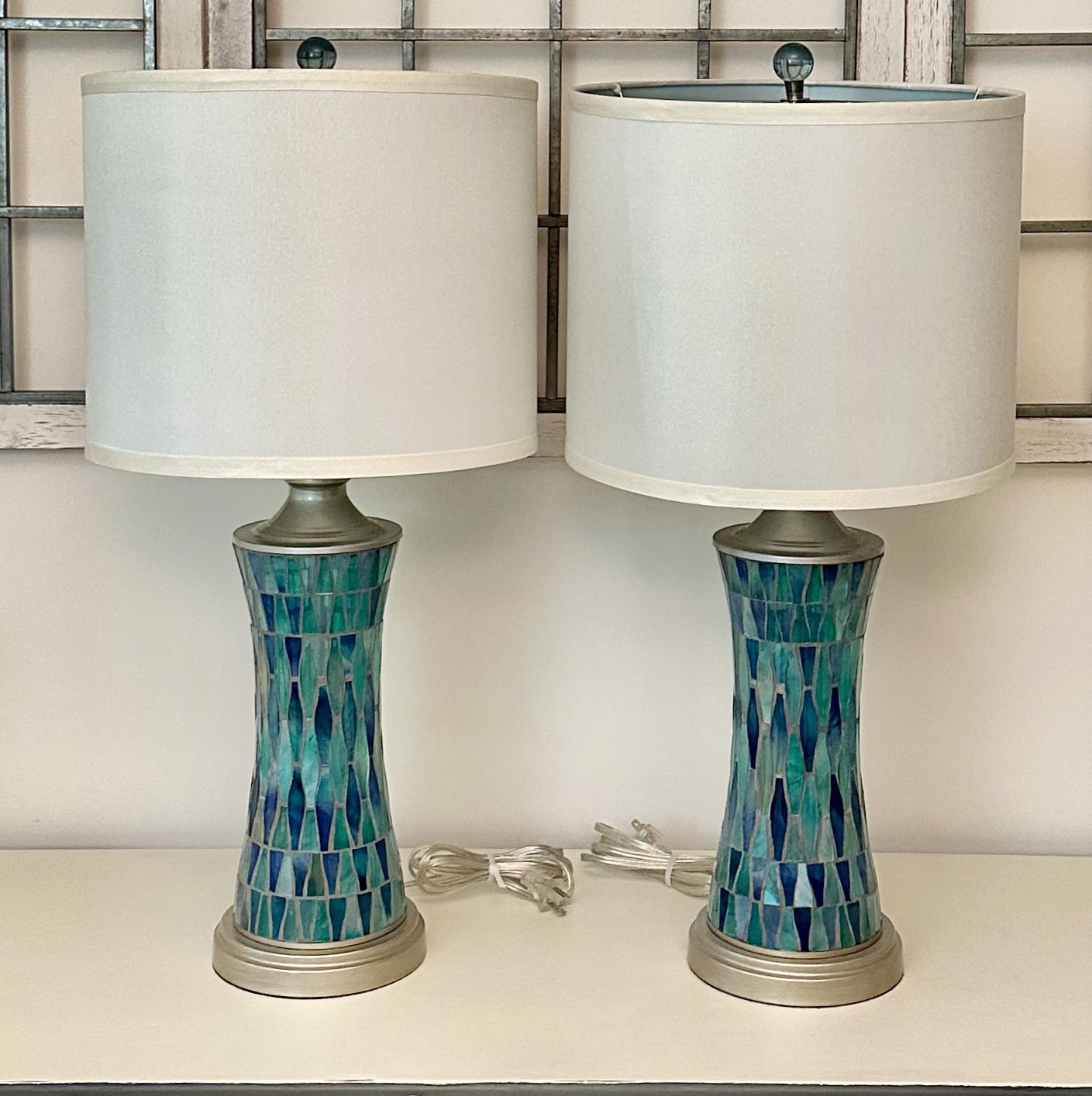 A set of two (2) Pier One Helena Blue Mosaic table lamps. The lamps measure 27” H overall. The lamps are in excellent condition, only used in house staging. For pickup only.