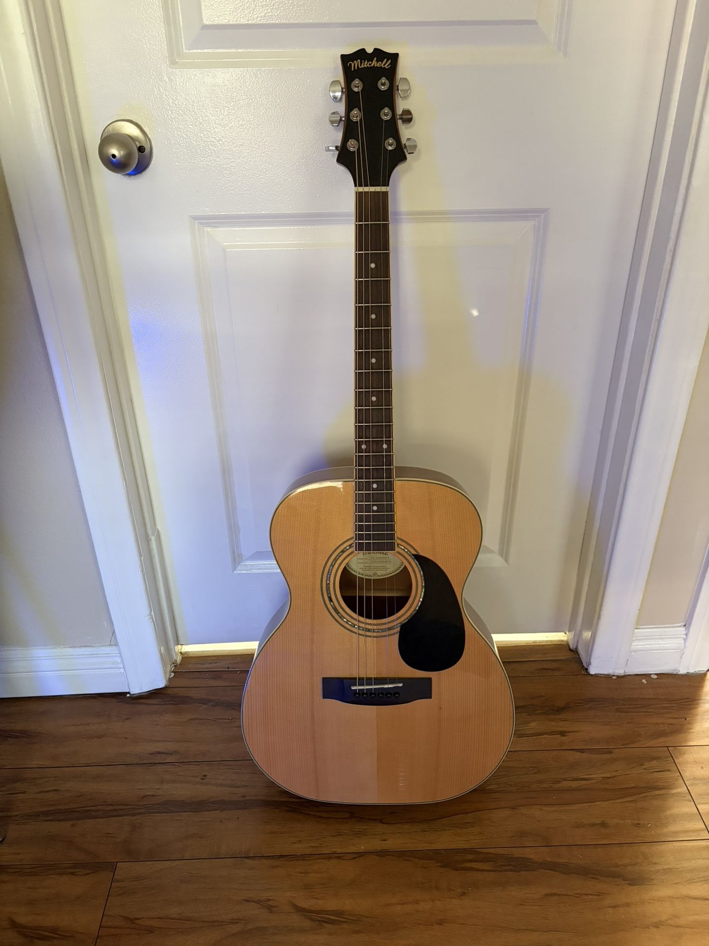 $60 OR BEST OFFER Mitchell MO-100SPK/N acoustic guitar in good overall condition. • One string is currently missing (needs replacement) • Small chip on the body/frame (cosmetic only) • Guitar is otherwise clean and fully functional • Neck and body are structurally sound A solid acoustic guitar for beginners or casual use. Easy and inexpensive fix to bring it back to full playing condition.