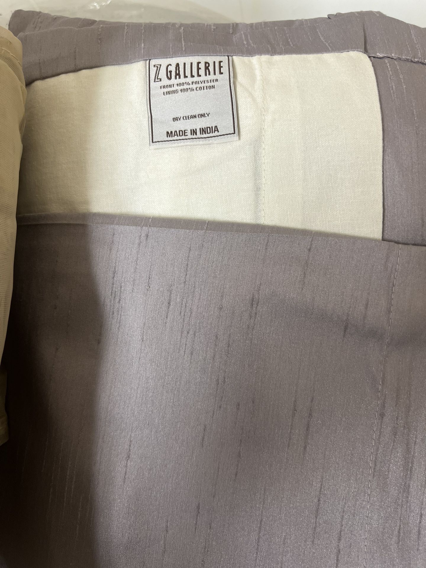I’m selling some extra Curtain panels from Z Gallerie. I no longer need them the light purplish grey color and the golden looking ones are from there the gold you see are sheer panels. There are 2 sets of the grayish purple color and one set of the golden beige color. And I believe it 108 in length can’t remember. Panels are dry clean only but I have washed on delicate and cold water and air dry them.