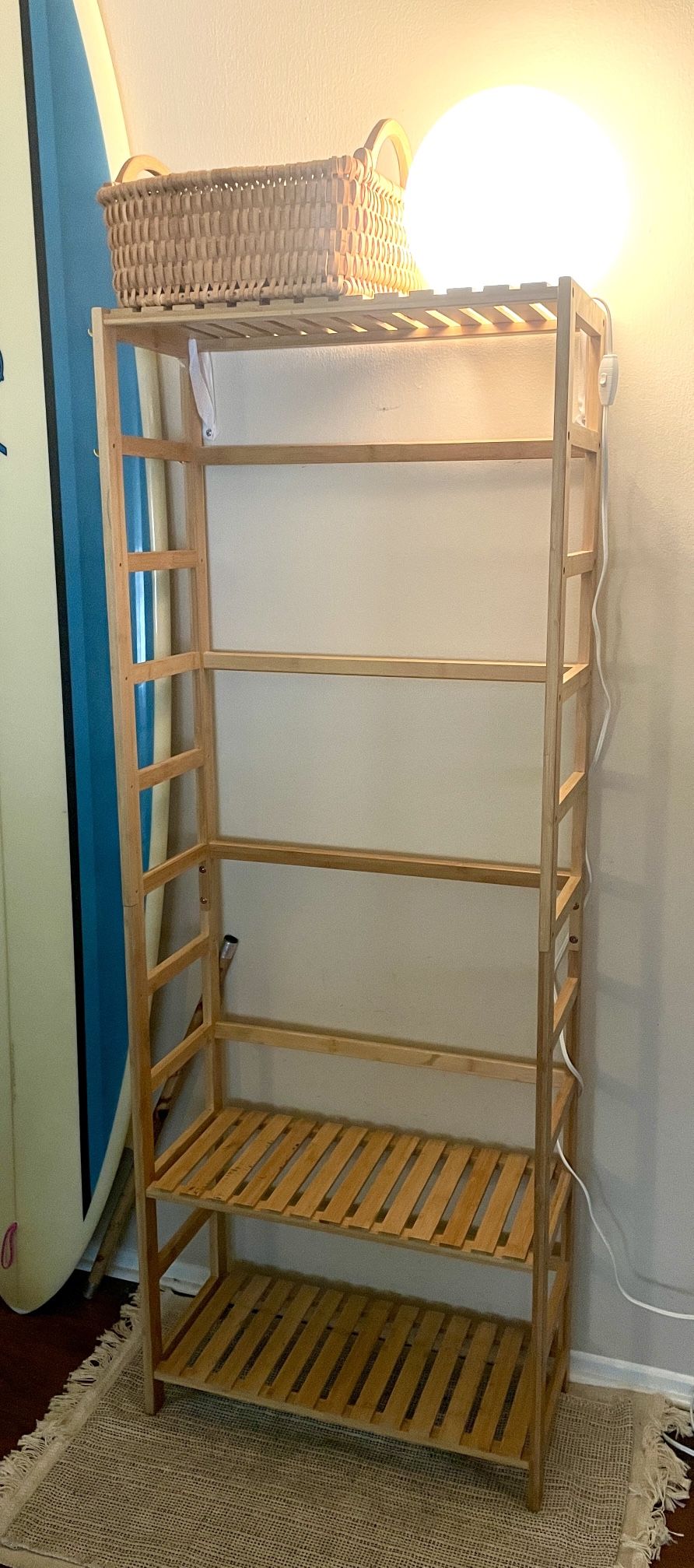 Assembled bamboo entryway open coat closet with shoe storage. Used for 2-years and outfitted with extra hooks for coats, bags and keys. Can easily fit up to 6-pairs of shoes. This is a super versatile piece that I’ve gotten great use of, sad to part with it but I am moving and it doesn’t fit my new apartments aesthetic. DIMENSIONS: 62” tall x 24” wide x 12” deep Comes with loops to secure against wall. Shelves are adjustable - requires a Philips head screw driver. Will include a few metal hooks if you would like. Surf board not included :)