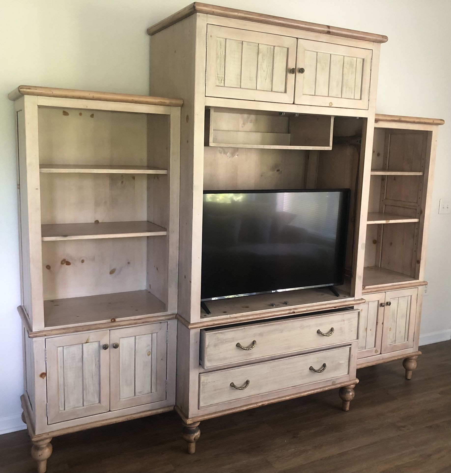 Book shelves: 69”x27” TV unit: 83”x42” It can house a TV that measures 31”x31” (43” without the doors). 1 drawer won’t close all the way