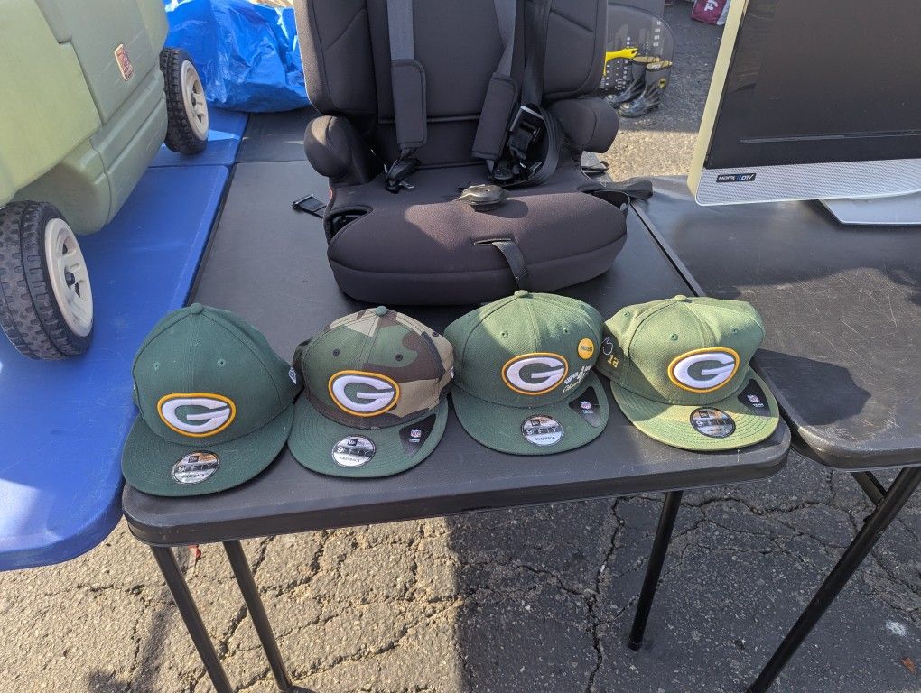 Hats are in very good condition. One is a super bowl hat and Aaron Rodgers is in stitching on one of them as well. Price includes all four heads.