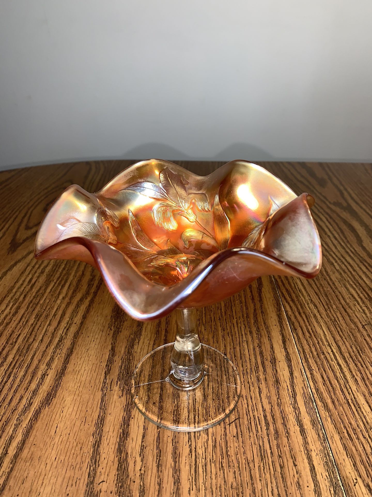 Vintage Marigolds Carnival Art Glass IRIS Compote Footed Stem Bowl Dish 6”x7”. Stunning color. No chips, cracks, or water stains. 6 1/4” tall, 6 3/4” at widest. Weighs 1.25 pounds. Ships same day from Indiana. See all my pictures as they are part of description. Pick up in New Castle Indiana or shipping is posted.