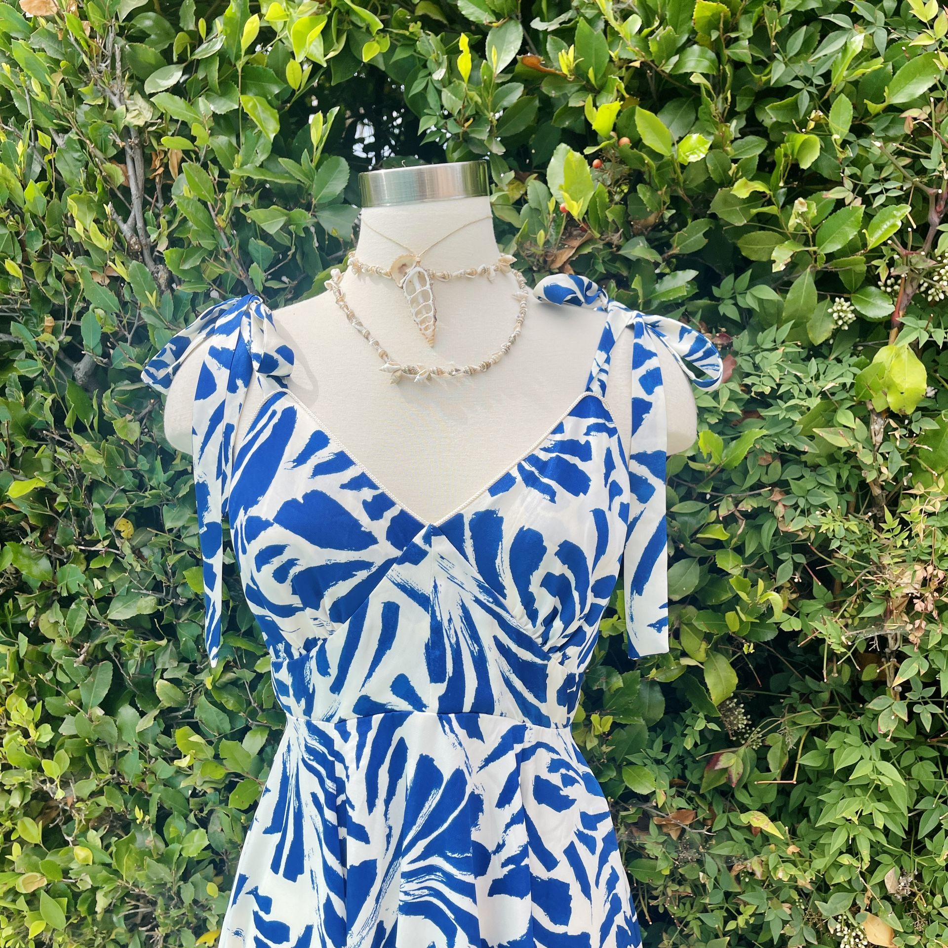 NWT Blue and white small floral print dress with tie shoulder straps, V-neckline, and elastic waistband. The bottom is asymmetrical and so gorgeous #floraldress #nwt #spring #summer #y2k
