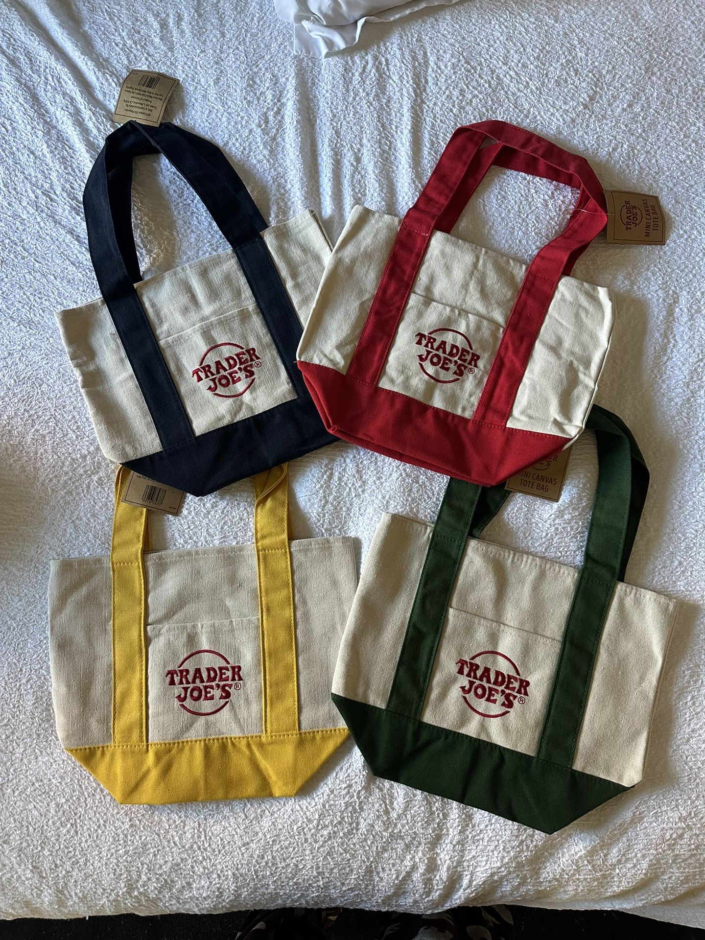 The iconic viral Trader Joe’s Mini Tote Bag everyone’s looking for! It’s the perfect size for quick grocery runs, lunches, errands, or everyday essentials. Made from durable canvas with the classic Trader Joe’s logo — cute, trendy, practical, and reusable. Tags are still on each bag as well! Selling a set of 4 (red, blue, green and yellow) for $100