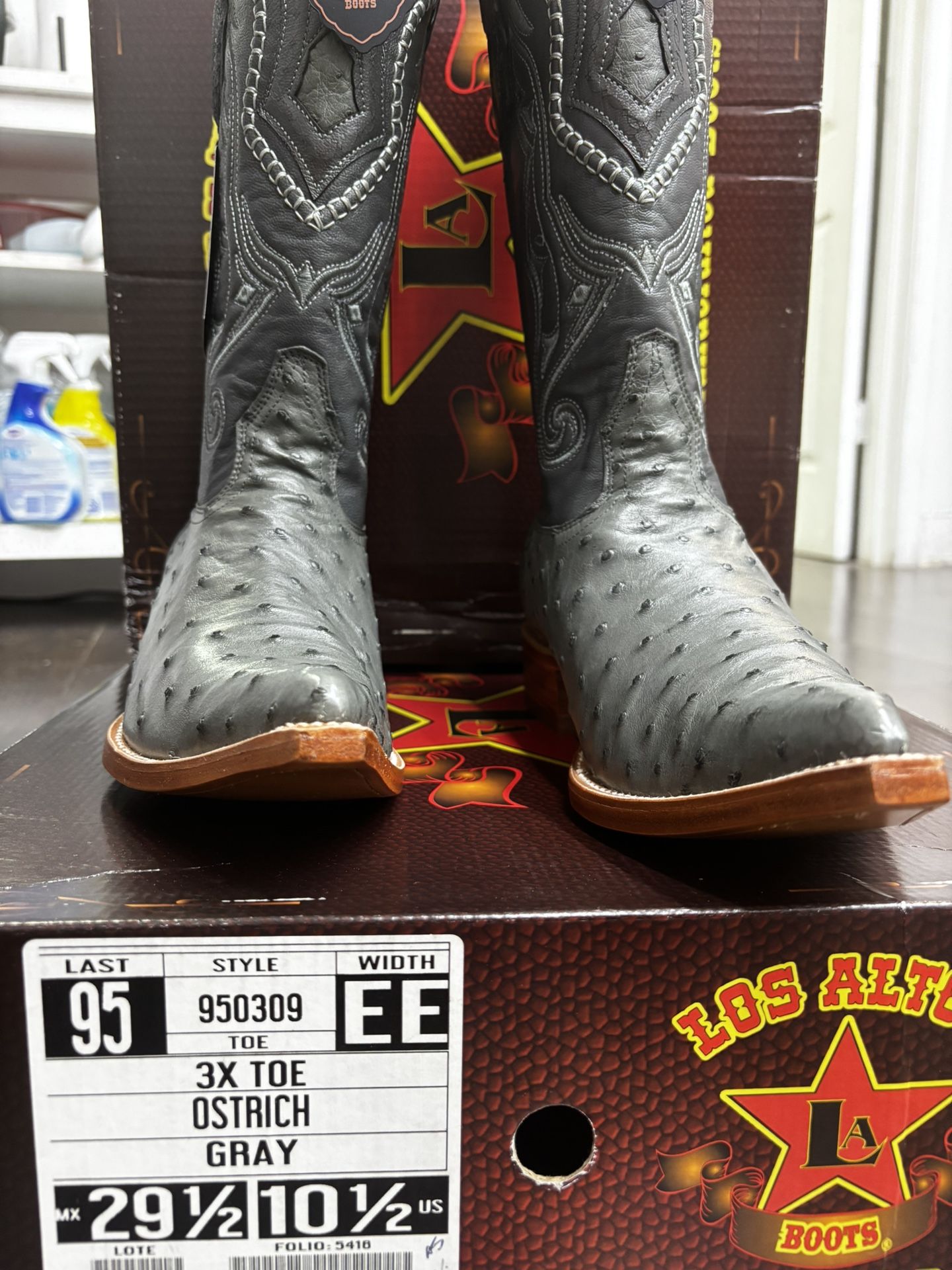 BRAND NEW These exceptional quality genuine ostrich skin cowboy boots are handmade by one of the finest exotic boots manufacturers, Los Altos. Los Altos offers sensational exotic skin boots that are completely hand crafted and hand stitched. The inside is a butter soft lambskin leather for superior comfort and the sole is handstitched in leather for excellent traction. The insole is cushioned for added shock absorption. The Los Altos ostrich collection doesn't use the "painted-on" process to color these boots like other manufacturers; instead, they use a special aniline process to dye the premium grade ostrich that the selected color permeates the skins thoroughly. The skins maintain its color for a lifetime and becomes more beautiful with age. ~Boots Overview~ Material Upper: Genuine Ostrich Skin Material Lining: Full Genuine Leather For Added Comfort And Durability Material Sole: Genuine Leather For Added Durability And Traction Style: Ostrich 950309 Color: Grey