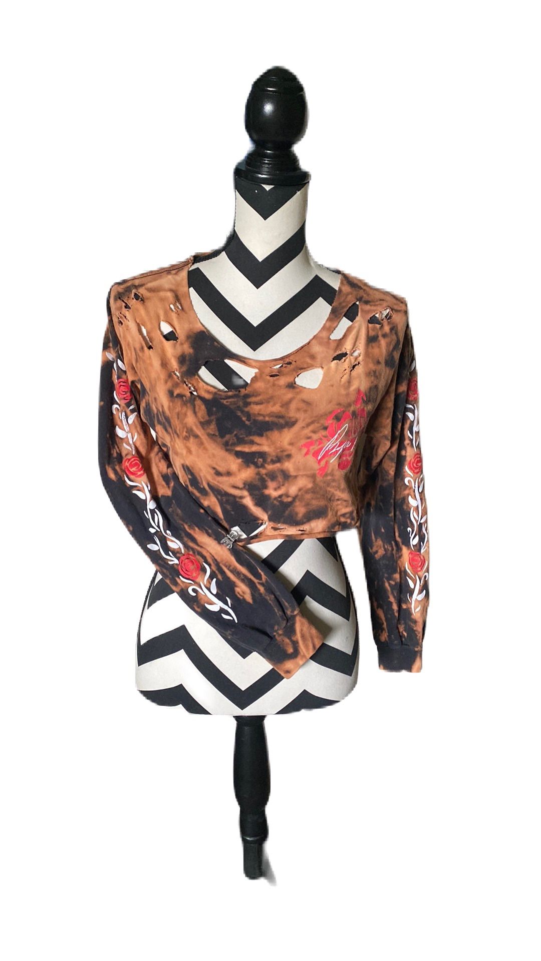 I’m sure if you watch YouTube either your daughter or you like Bryce Hall ! My daughter and I want to go see him she got a few shirts and this one she hand did herself It’s distressed with some holes in it the long sleeves have no holes and they have roses going down both sleeves. It says Bryce hall in a rose on the chest area And it’s tie-dye black and a cool looking orange Size is mens small I ship same day Thank you